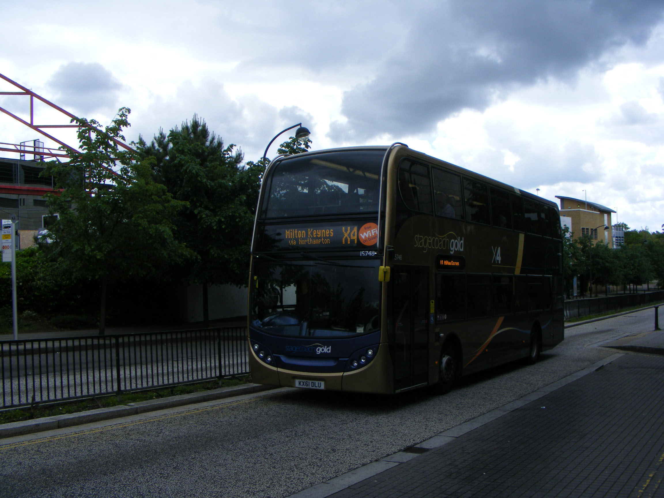 In 2011 the X4 was obviously proving a success and was upgraded to Stagecoach Gold status with new leather seated and wifi equiped Scania N230UD buses. Seen in MK in June 2012 is 15748 (KX61DLU).