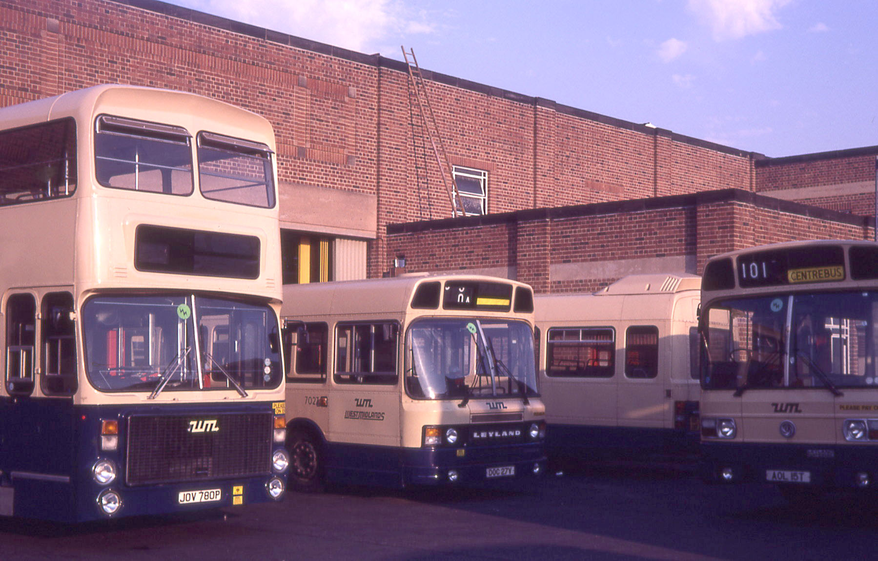 Not looking its best, National 1792 (KOM792P) is seen in a maintenance bay, one of the batch delivered and liveried specially for NEC services with dual door bodies. It still has the NEC flag amidships, but has lost the "National Exhibition Centre" lettering above the side windows. The bus went on to have an interesting life, though first acquired standard service livery after its NEC days. It was later painted silver and fitted with a retractable awning on the nearside and used to promote Travelcard sales and as a mobile information unit. It later continued its promotinal work repainted yellow, red and blue in which state it was later sold to London Transit at Stansted, seemingly ending its days as a source of spare parts. Anyone want a side awning for a Leyland National?