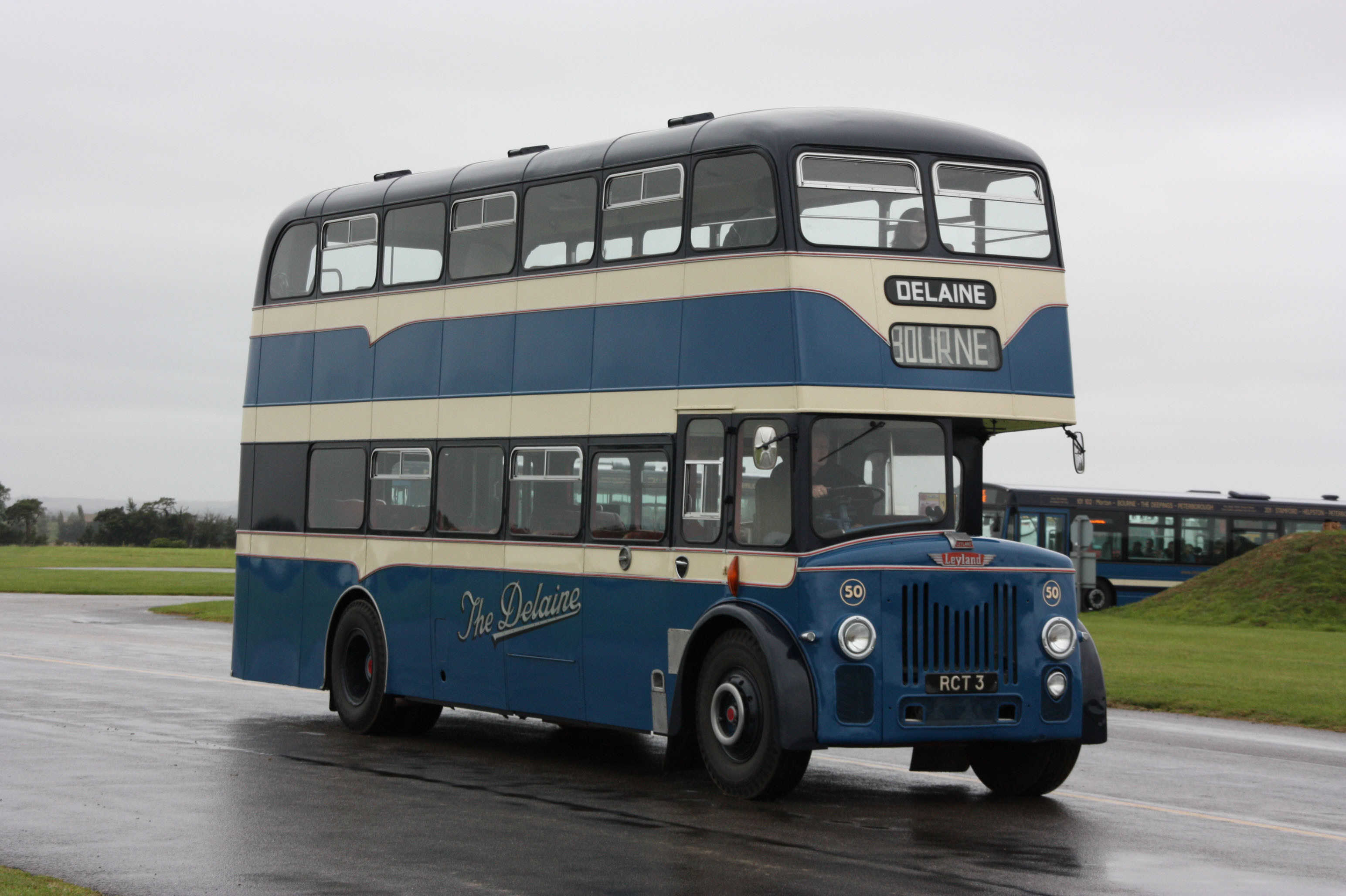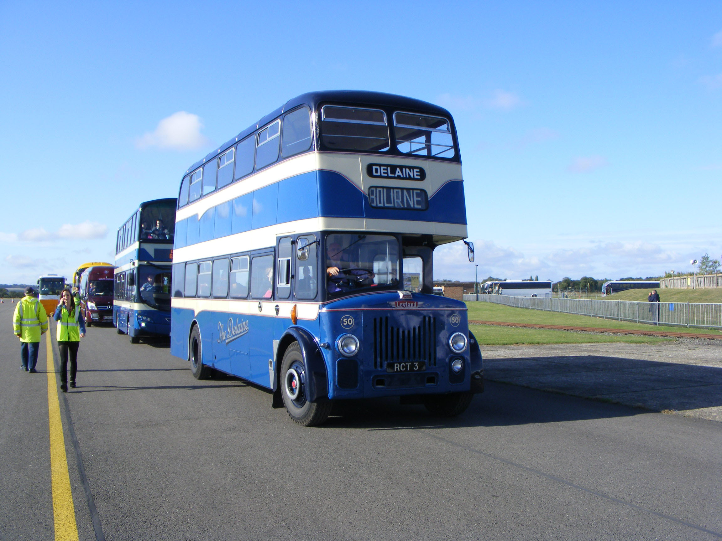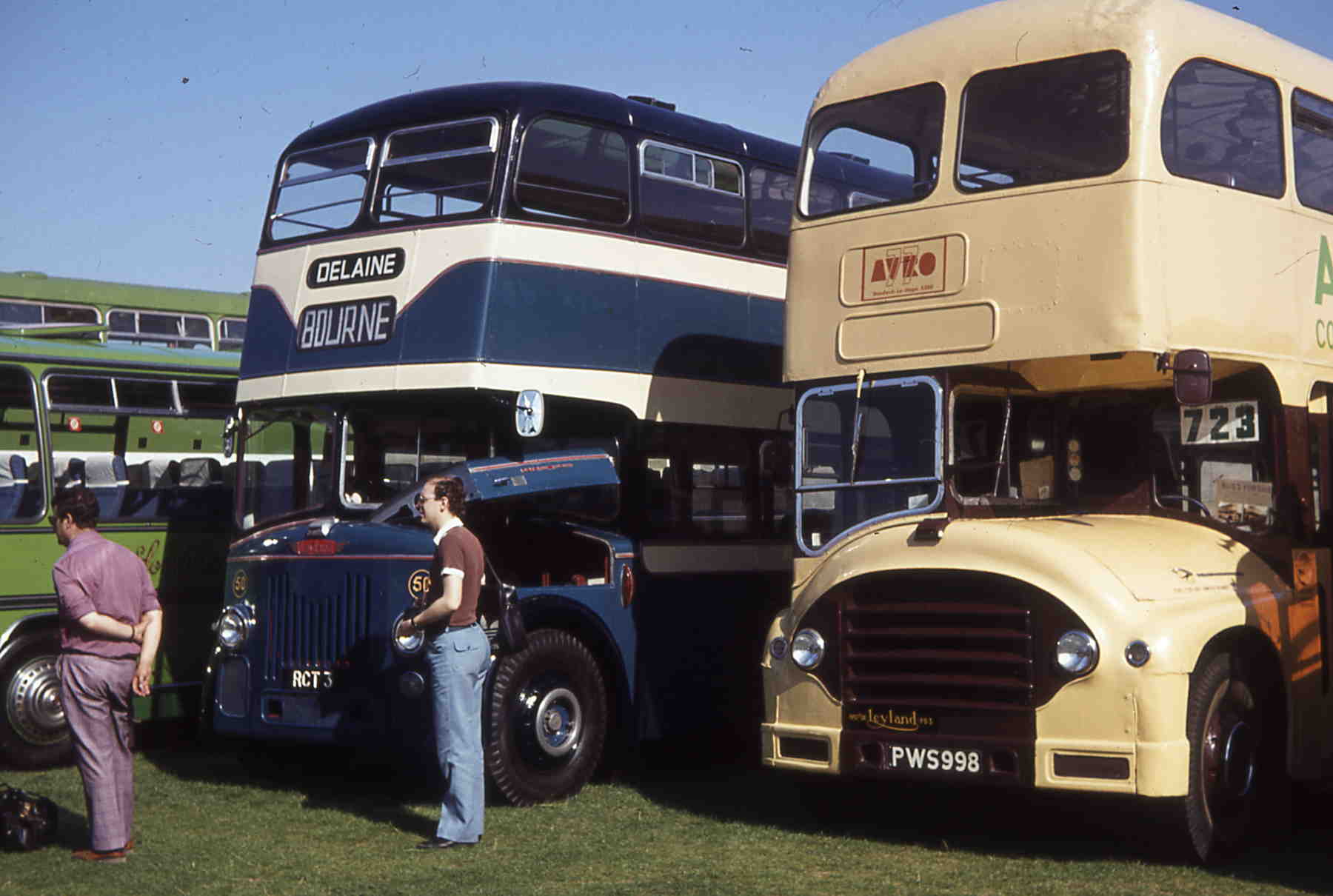 Two PD3 doubledeckers at Showbus 80 at Thorpe Park: On the left is Delaine's 50 (RCT3), now preserved by the company and bearing rare Yeates bodywork dating from 1959. Alongside a more familiar combination, a PD3 with Alexander bodywork, formerly with Edinburgh City Transport as 998 (PWS998) and of a type familiar to the fleet, but not when new in 1957. The grill is 'St Helens' style, but not quite. Subsequent Scottish deliveries had grills more like Delaine's 50. |