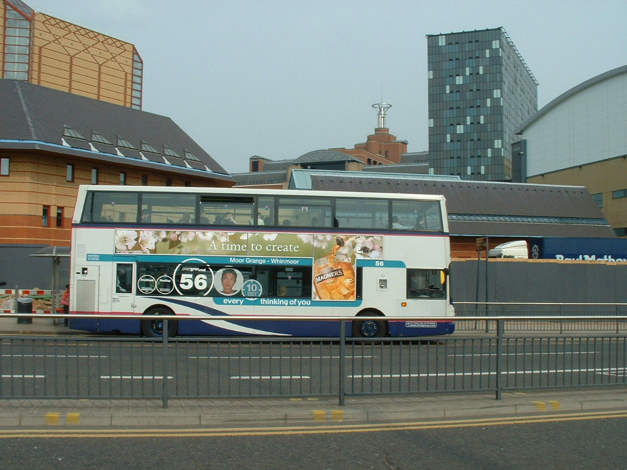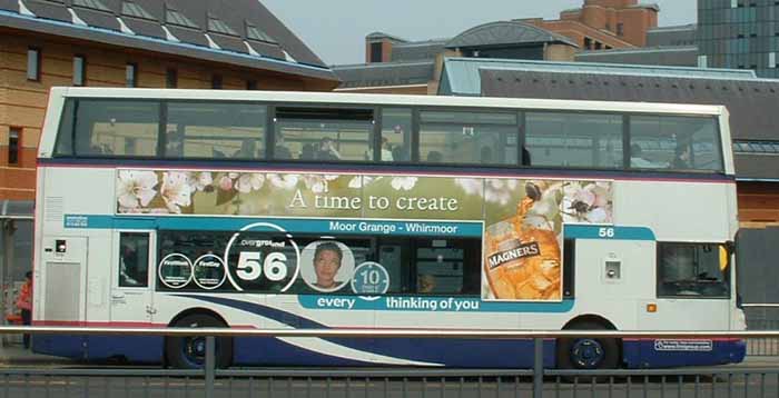 First deployed its Overground network concept to Leeds, with each route having its own colour in London Underground style. This unidentified Alexander ALX400 bodied Volvo B7TL has side branding for route 56 in turquoise. Other buses in the fleet received similar branding for different routes, but operationally those on the ground did not share the vision of those despatching and allocating buses in the morning run out, consequently the wrong branded buses appeared on the wrong routes. Slowly the individually branded buses gave way to destination displays carrying the route colour information, at the expense of destination details.