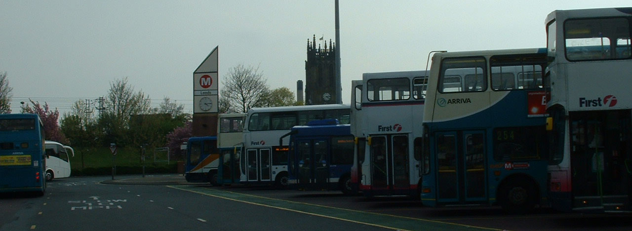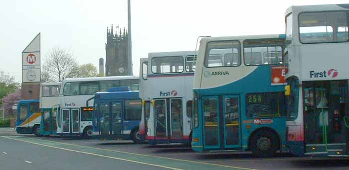 A mix of buses in Leeds Bus Station. Joining Alexander RH First vehicles are Arriva Yorkshire deckers, including a relatively rare Plaxton President bodied example, a Yorkshire Coastliner Volvo B7RLE, a Stagecoach Hull Volvo B10M as well as a First Yorkshire Volvo B7TL Wright Eclipse Gemini.