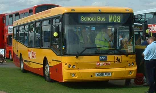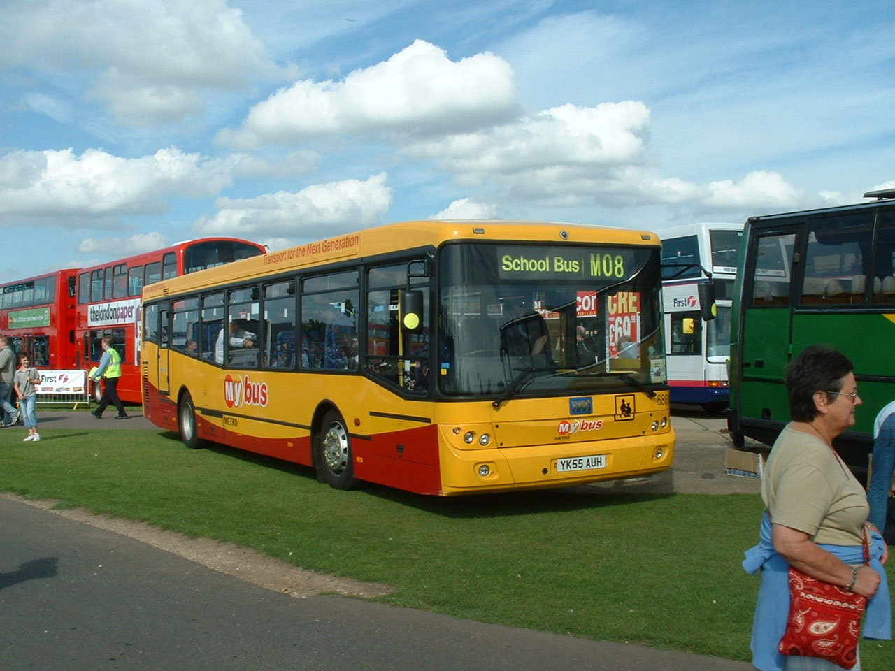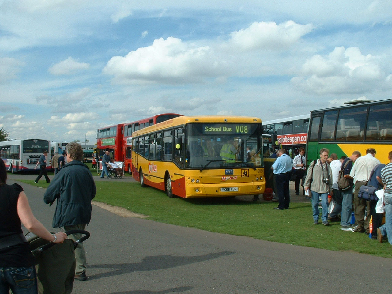 Despite being over here and over there, First's attempts to import bus concepts from across the Atlantic have not met with success. The Greyhound UK venture has shrunk away and American school buses never really caught on, despite kicking off the idea with a batch of right hand drive Bluebird AARE models imported to demonstrate the concept, the key facet of which - allocated seats checked off by the driver while boarding - was not really vehicle dependent. This bus, YS51YVH, was allocated to Halifax and is seen behind the interested crowds at SHOWBUS 2001. |