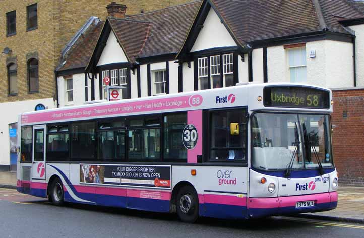 In June 2012 First Berkshire DMA40271 (T375NUA) is seen on the 58 in Uxbridge's Bus Station. The bus from First York blends with the native SLF/ALX in the Berkshire fleet. It is sporting full Overground branding with pink decals for the 58. ![]() |