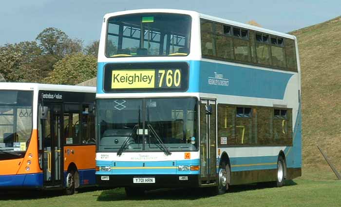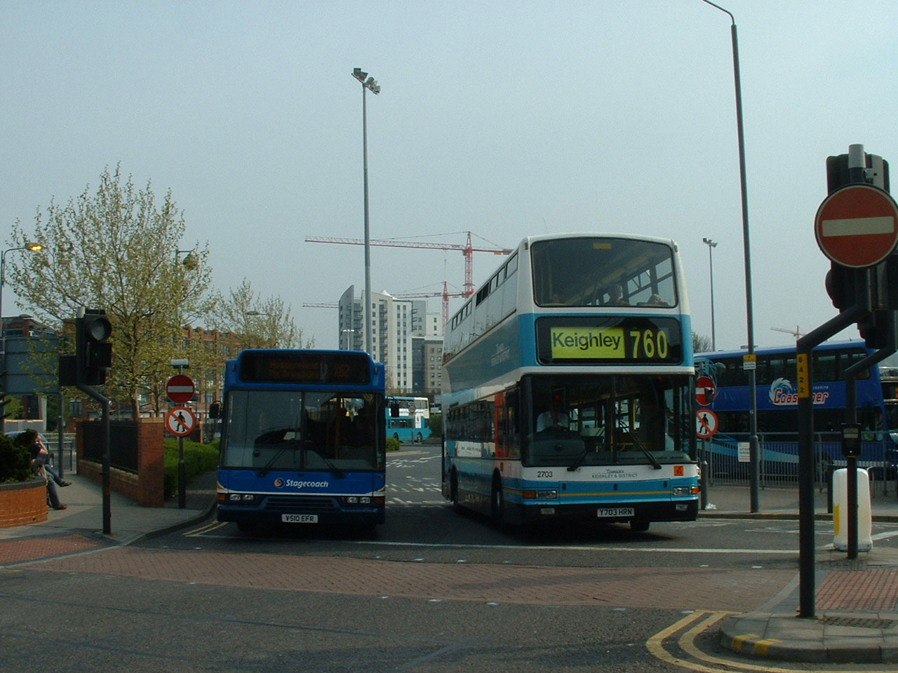 Sister vehicle 2703 (Y703PRN) is seen earlier that year in April leaving Leeds Bus station for Keighley in the company of a Stagecoach Yorkshire bus. The singledecker was new to London Traveller as 510 (V510EFR), a Volvo B6LE with East Lancs body. It joined the YTC fleet and is now Stagecoach 31960.