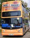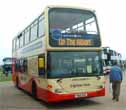 The 30th rally in 2002 saw entries hit a definite 400 for the first time, often that figure is exceeded before the day, but the Golden Jubilee occasion verified a 400+ display on the Sunday. Some regular entrants missed the occasion as every coach company in Britain was working flat out on Showbus day because of the Countryside Rally in central London. For the first time in many years a road run - the Gold Run - from Trumpington Park & Ride allowed a select group of Golden Jubilee associated vehicles to parade to Duxford. Adding to the international element Kowloon Motor Bus entered one of their Alexander ALX500 bodied Dennis Tridents in the event. EFE SHOWBUS international was an official Golden Jubilee event in 2002 and the display of gold liveried vehicles was a great tribute to Her Majesty the Queen. KMB's gold Trident formed part of the Jubilee display.