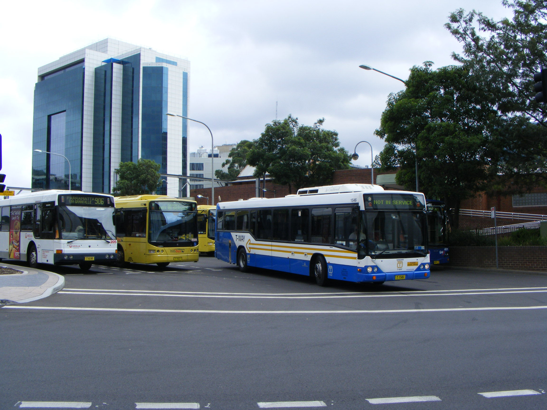The West Sydney T-Way fleet was renewed with Custom B12BLEs replacing the Custom Citaro style Mercedes. Volvo B12BLE 1536 (MO1536) is seen on the new stands in Parramatta in August 2005.