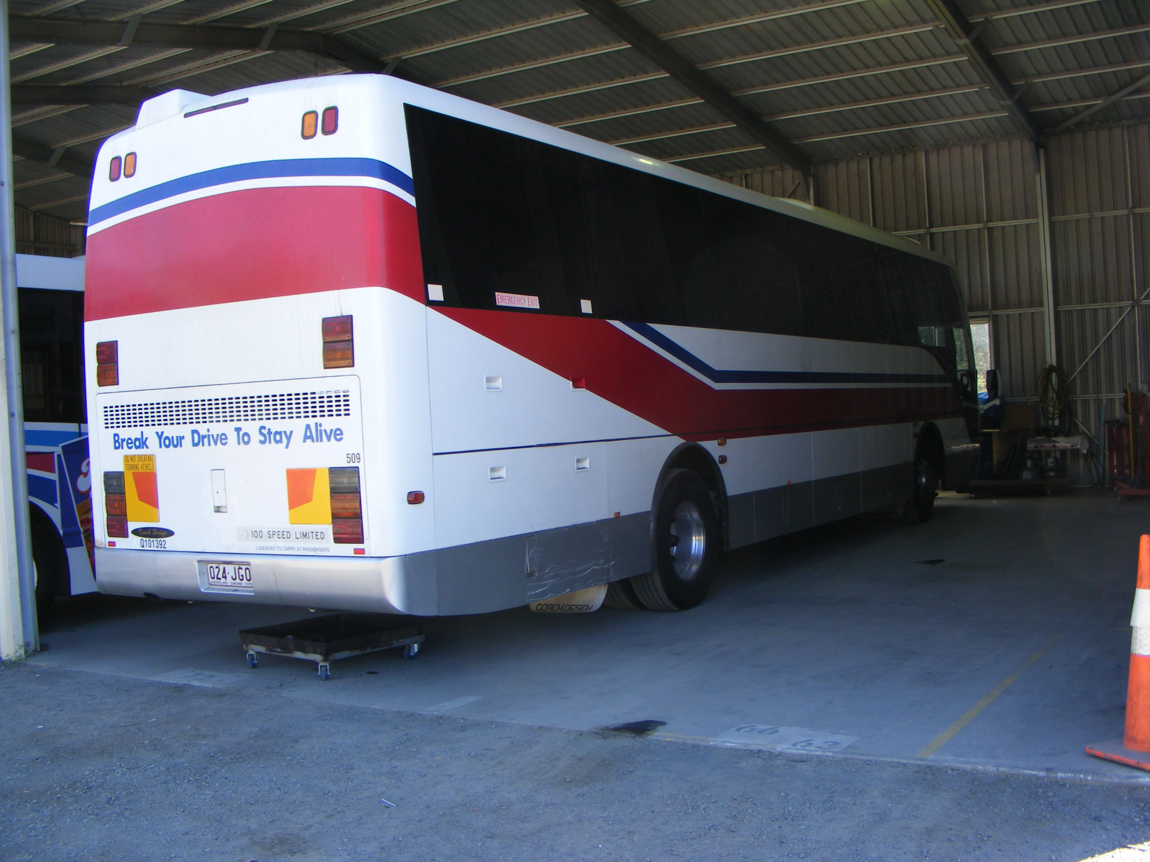 Still in Victoria's V-Line livery is former Wangaratta Coachlines 18 (0648AO) a 1999 Coach Design bodied Scania K94EB. The coach joined Wide Bay with the Bay Bus & Coach operation. It is seen nose in at Hervey Bay depot.