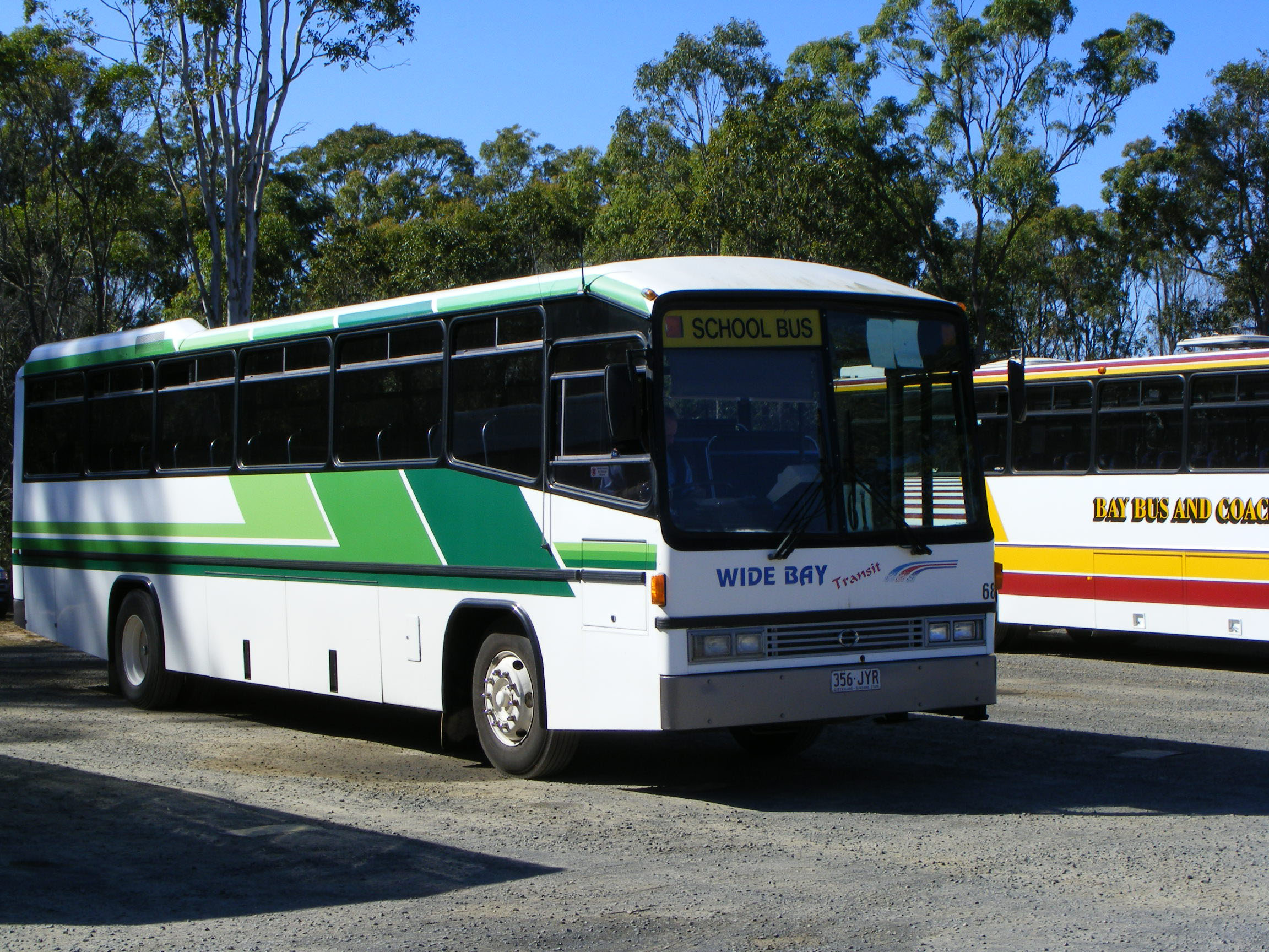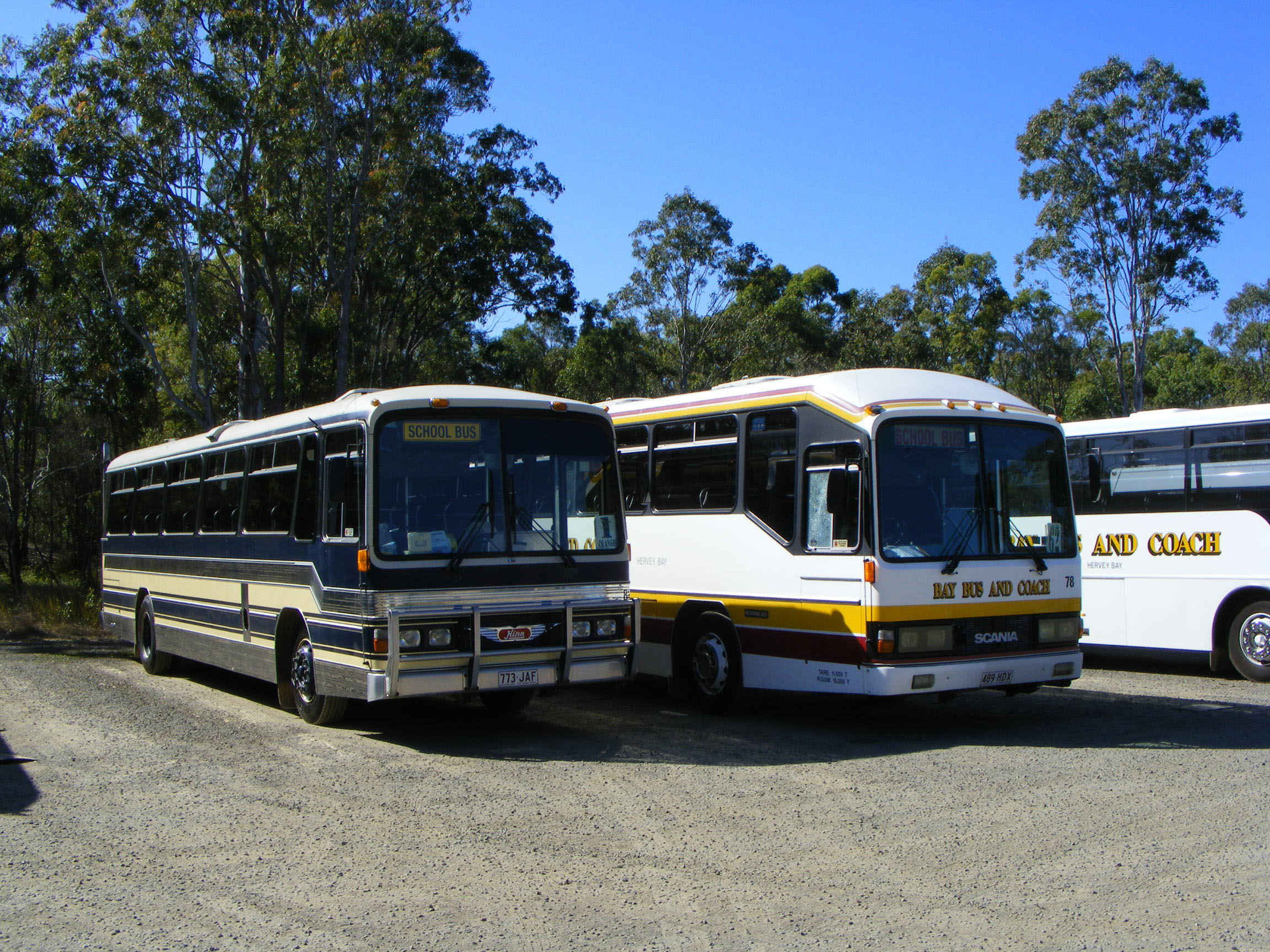 In Bay Bus and Coach livery is 78 (489HDX), a 1990 Custom bodied Scania K93CR new to Hope's Coaches of Gunnedah in New South Wales. The Custom bodied Hino RG197K alongside, 81 (773JAF), is another Bay vehicle, but still in the livery of Harris Park Transit where it was registered MO7794. |