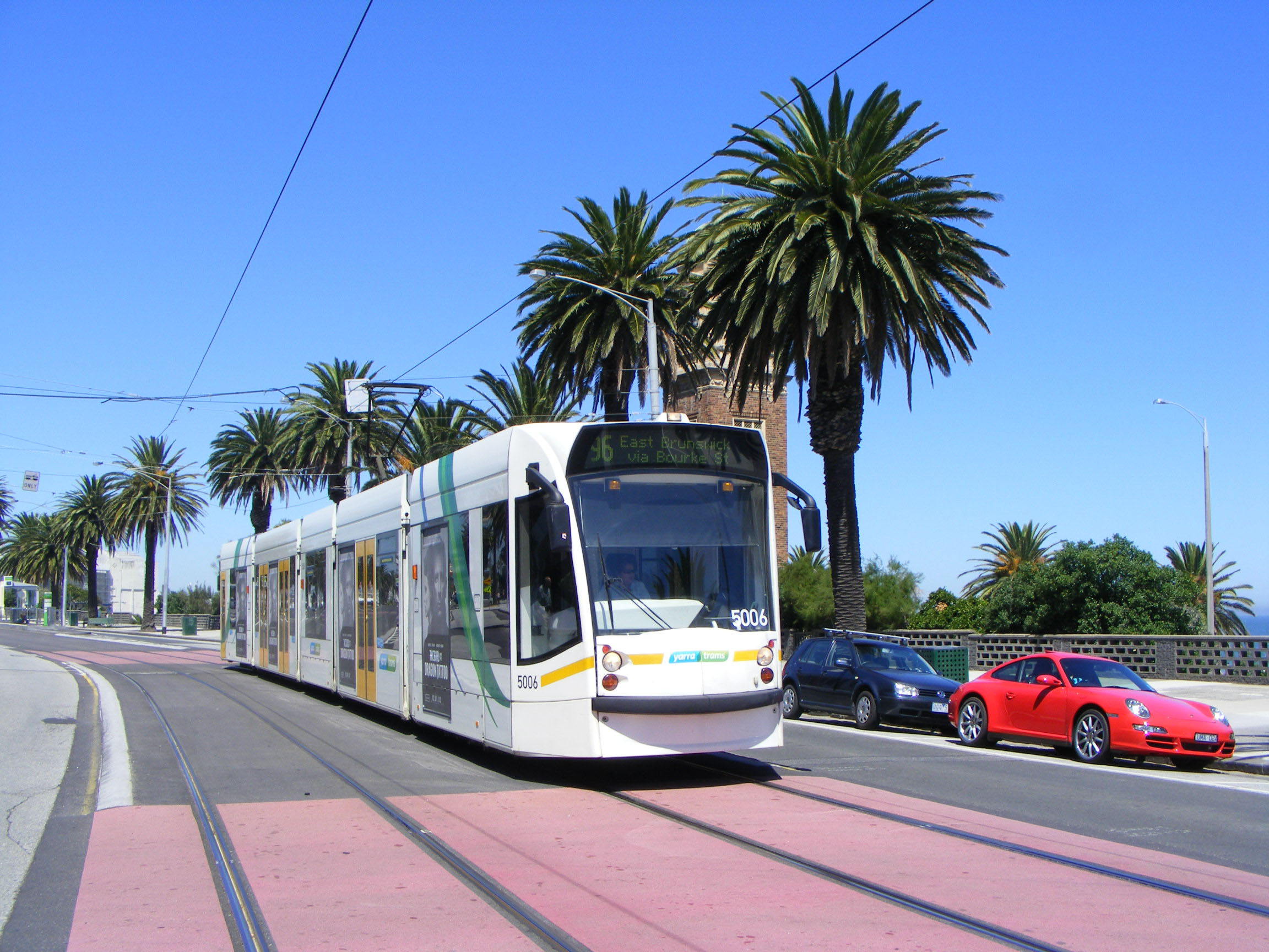 Easter 2007 sees Yarra Trams Siemens Combino 5018 in Acland Street, St Kilda on its regular haunt: the 96 to East Brunswick. The rocket ship is crashing into a nearby shop, not the tram.