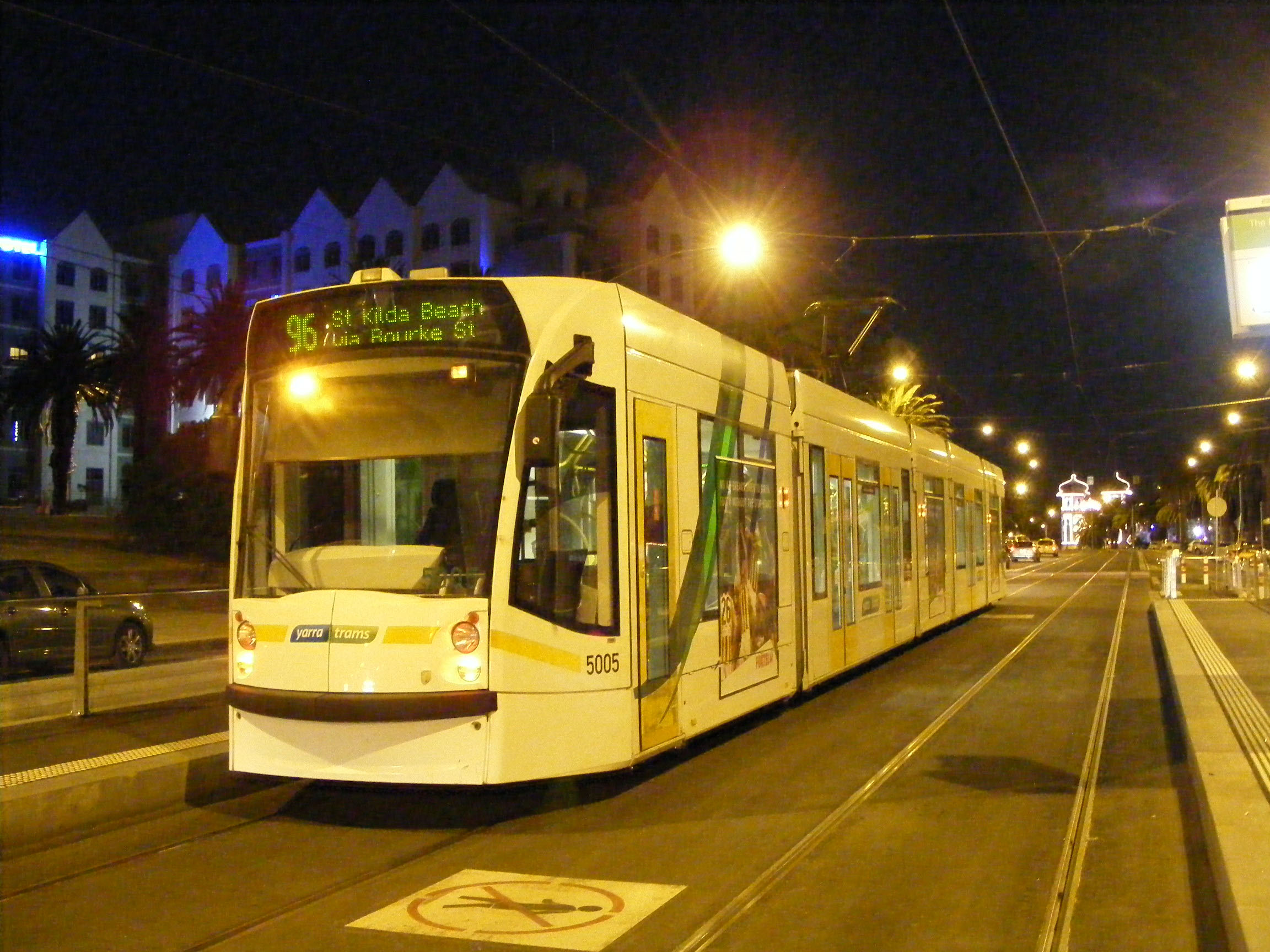 Car 5025 is seen one evening in early 2012 on the Embankment in St Kilda with the entrance to Luna Park Fun Fair sparkling in the background.
