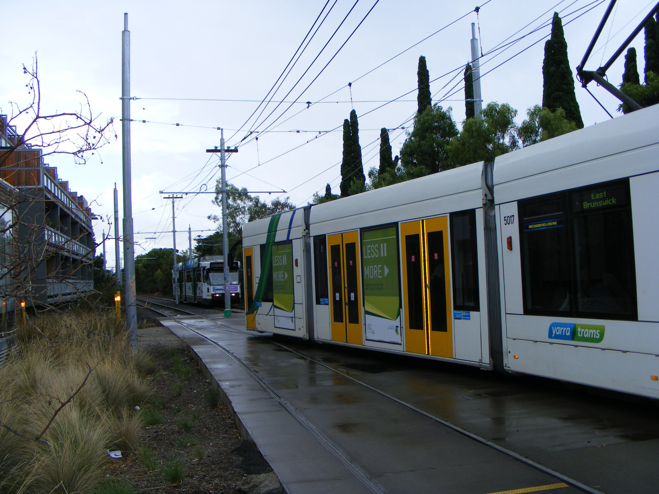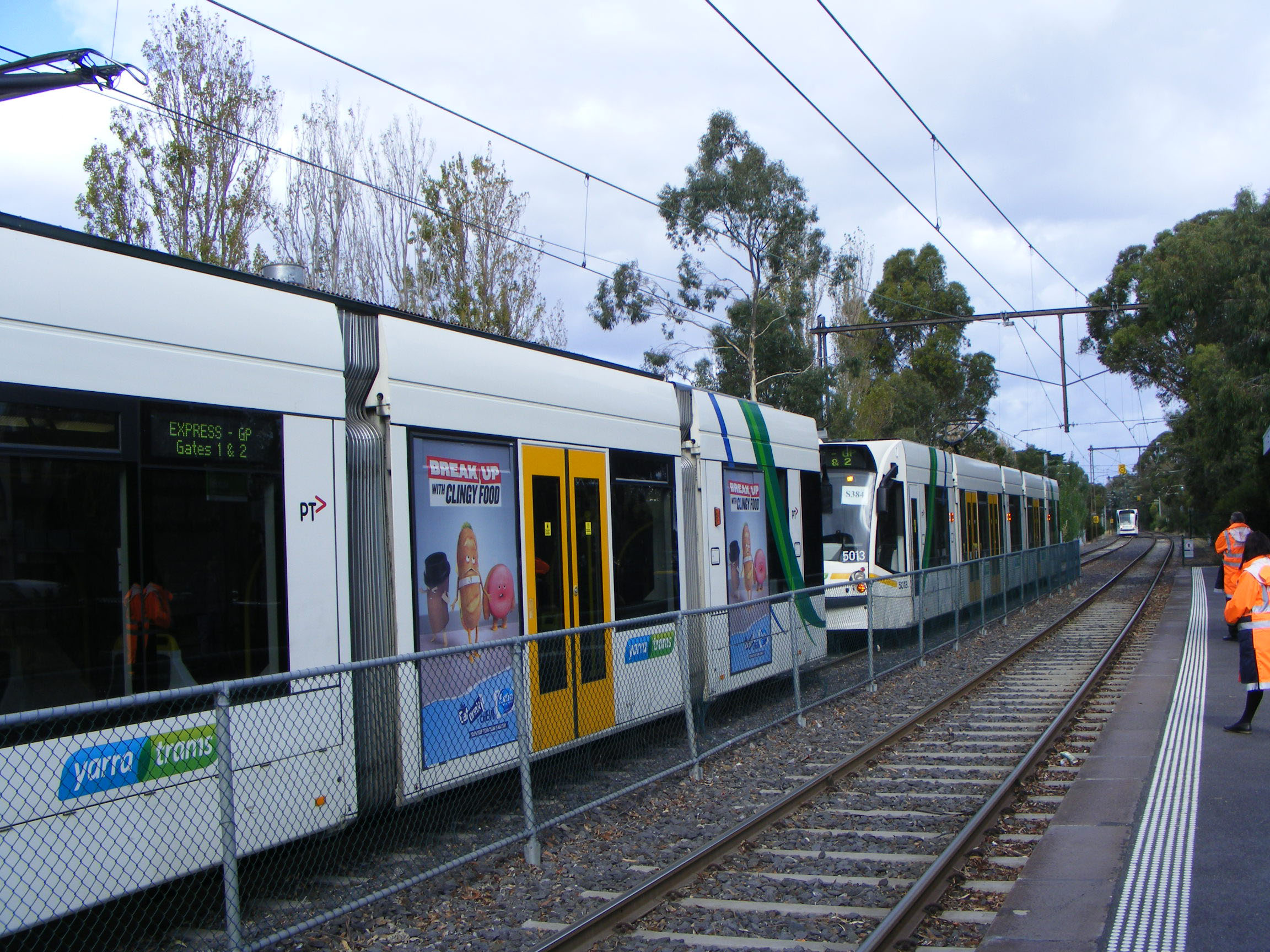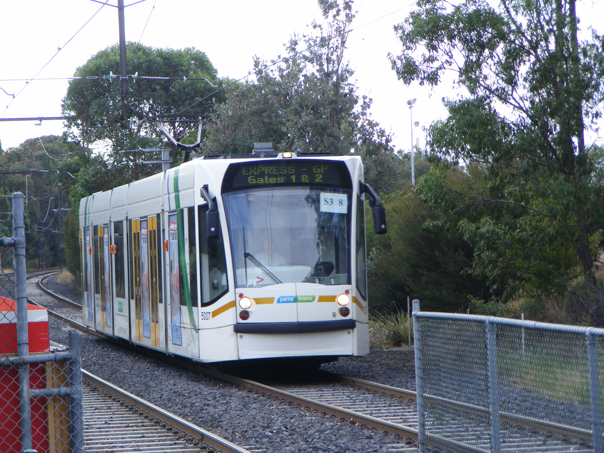 The Melbourne Grand Prix disrupts normal service on route 96 with buses replacing the secion between the city and St Kilda and the tram service from the north terminating in the city. The normal reserved track on the old railway line and the regular Combino trams - amongst others - shuttle express from Southern Cross Station via the Crown Casino to the race track entrances in Albert Park. Seen on duty for the 2013 Grand Prix in March is 5007 with desto set to "Express - GP Gates 1 & 2".