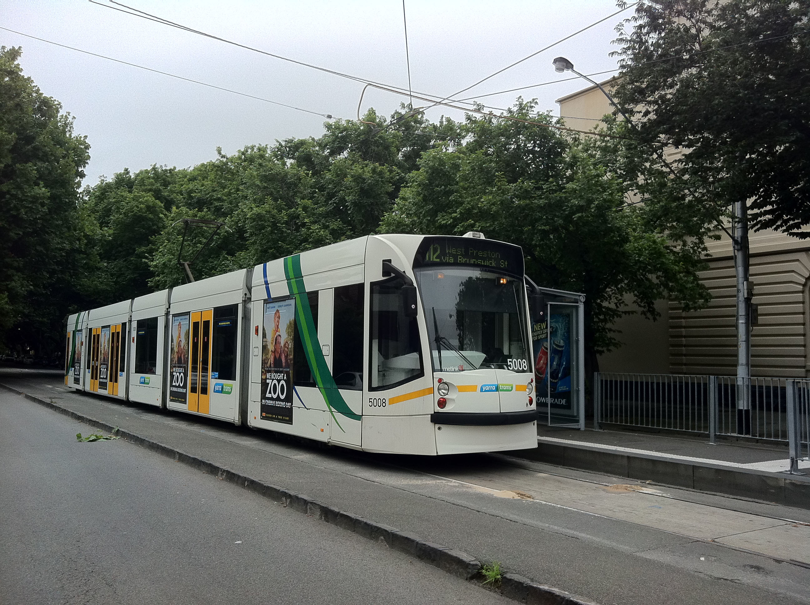 Sunday and evenings used to see the regular use of Combino five section trams alongside the normal A and B class trams on the 112. Combino 5008 is seen at the Fitzroy Street terminus of the 112. The 112 has since been renumbered 12 and neither Combinos or E Class trams appear regularly.