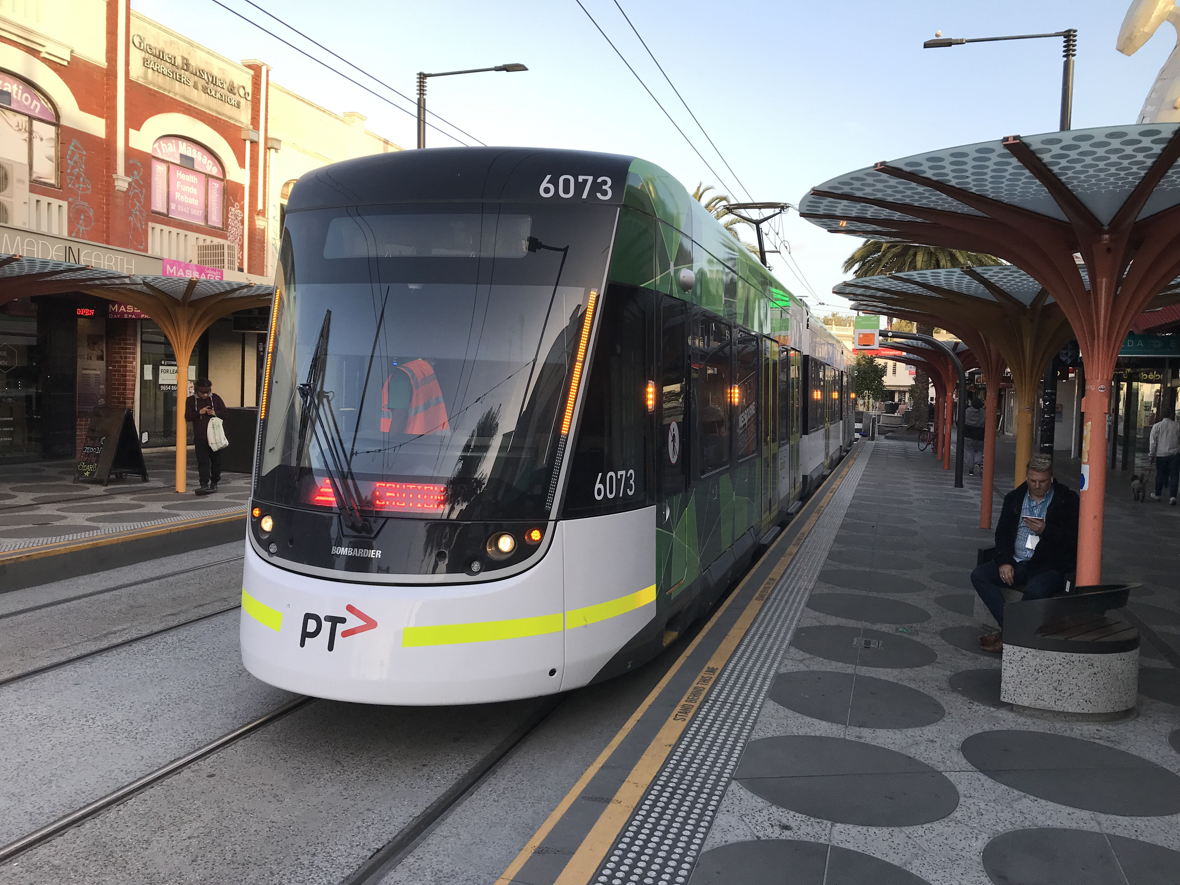 Early evening April sun glows on the buildings behind 6073 at Acland Street a few days later.