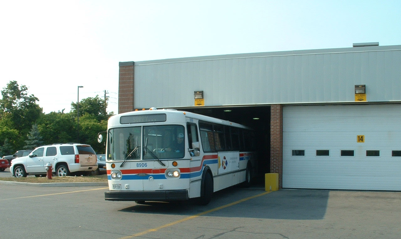 First of the trio of 1996 New Flyers, 9638, was seen in the sheds repainted in the new livery alongside Orion V 0181 seen earlier in 2003.