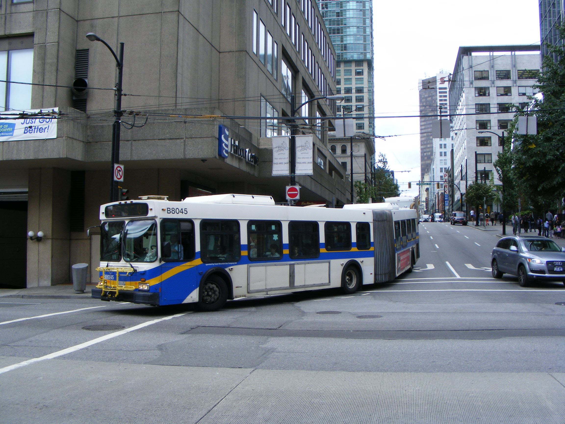 Most of the New Flyer D60LF artics were in a special livery for the B-Line rapid transit services, but, following the introduction of the new Canada Line rail service to the airport, the pioneering 98 B-Line was withdrawn. New Flyer B8045 is seen downtown in August 2009 shortly after Canada Line opened. |