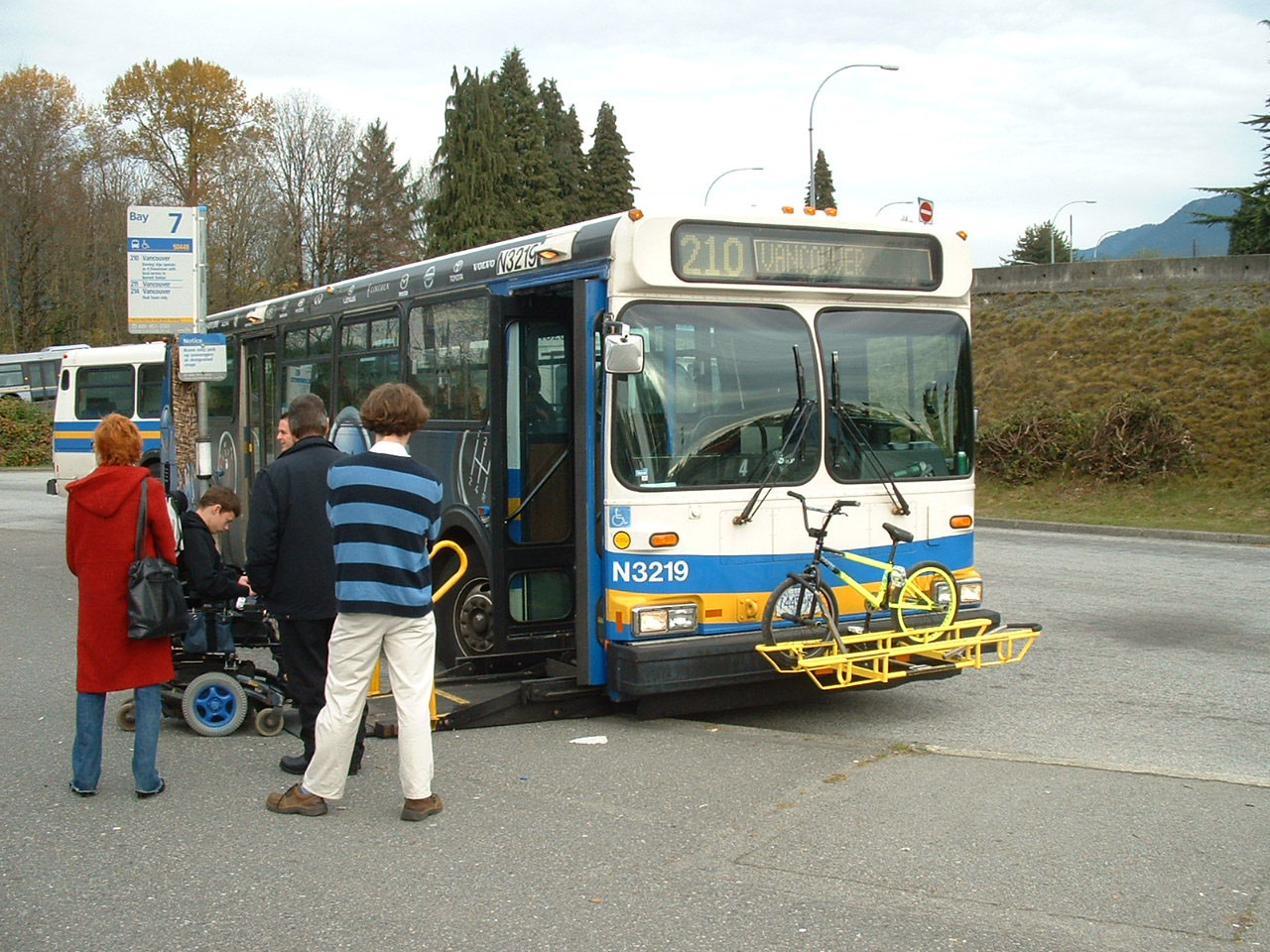 Passengers waited patiently while the disabled passenger was lifted aboard N3219 by the powered lift built into the door and floor of the high floor New Flyer D40HF.
