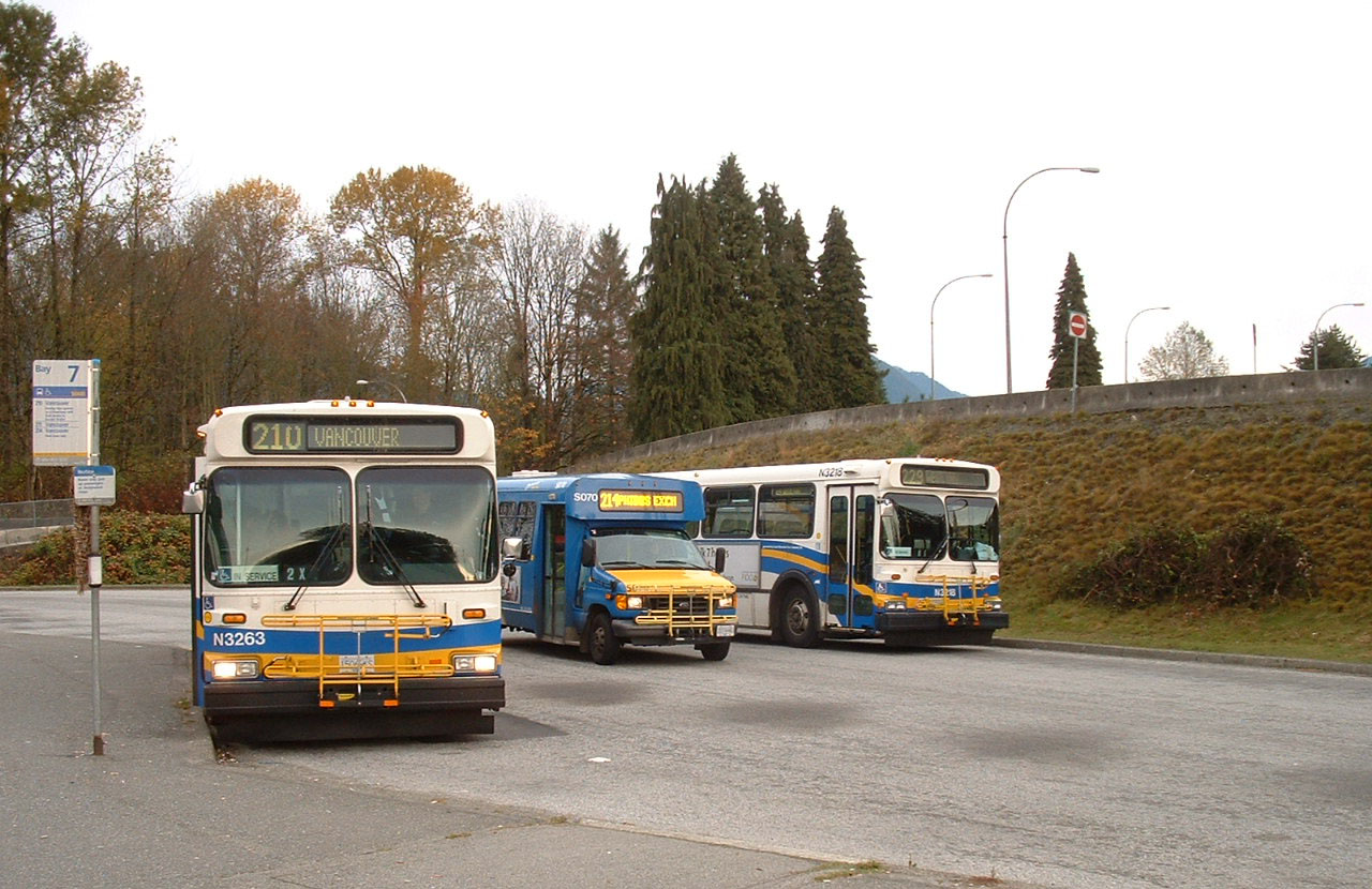 Several D40HFs at Phibbs Exchange plus a New Flyer D40LF at the rear. Phibbs Exchange is on the north shore of Vancouver Harbour, near the Ironworkers Memorial Bridge crossing. The exchange is in a relatively remote location and is empty more than busy, but services are timed to coincide affording connections across the north shore as well as across the bridge to the city.