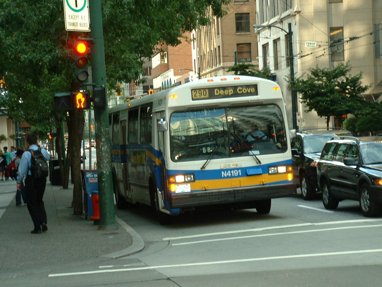 Coast Mountain Bus once had a large fleet of MCI Classics - a legacy from BC Transit in red and white. In 2004 few were left, but North Vancouver based N4191 was still going strong having gained the new Coast Mountain Bus livery. |