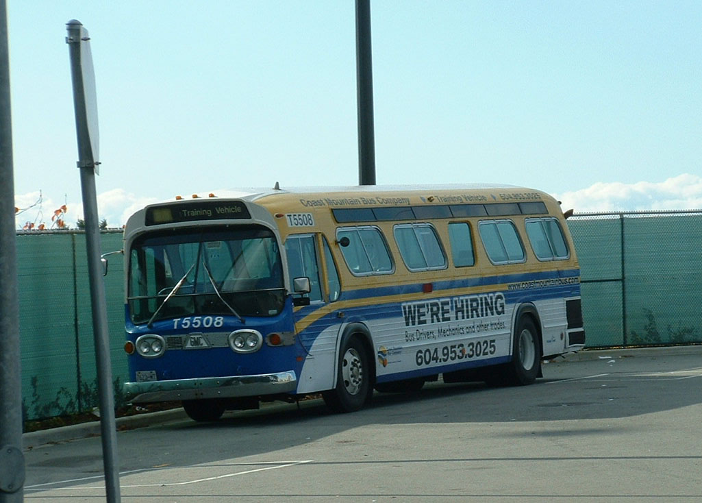 Another survivor in 2007 was T5508, a GMC New Look Fishbowl with a new lease of life as a driver trainer. Painted in a driver recruitment livery the bus is parked in the Vancouver Transit Centre |