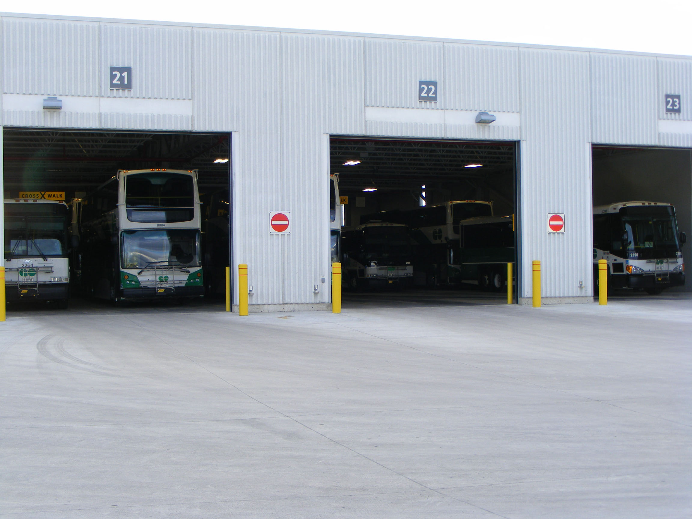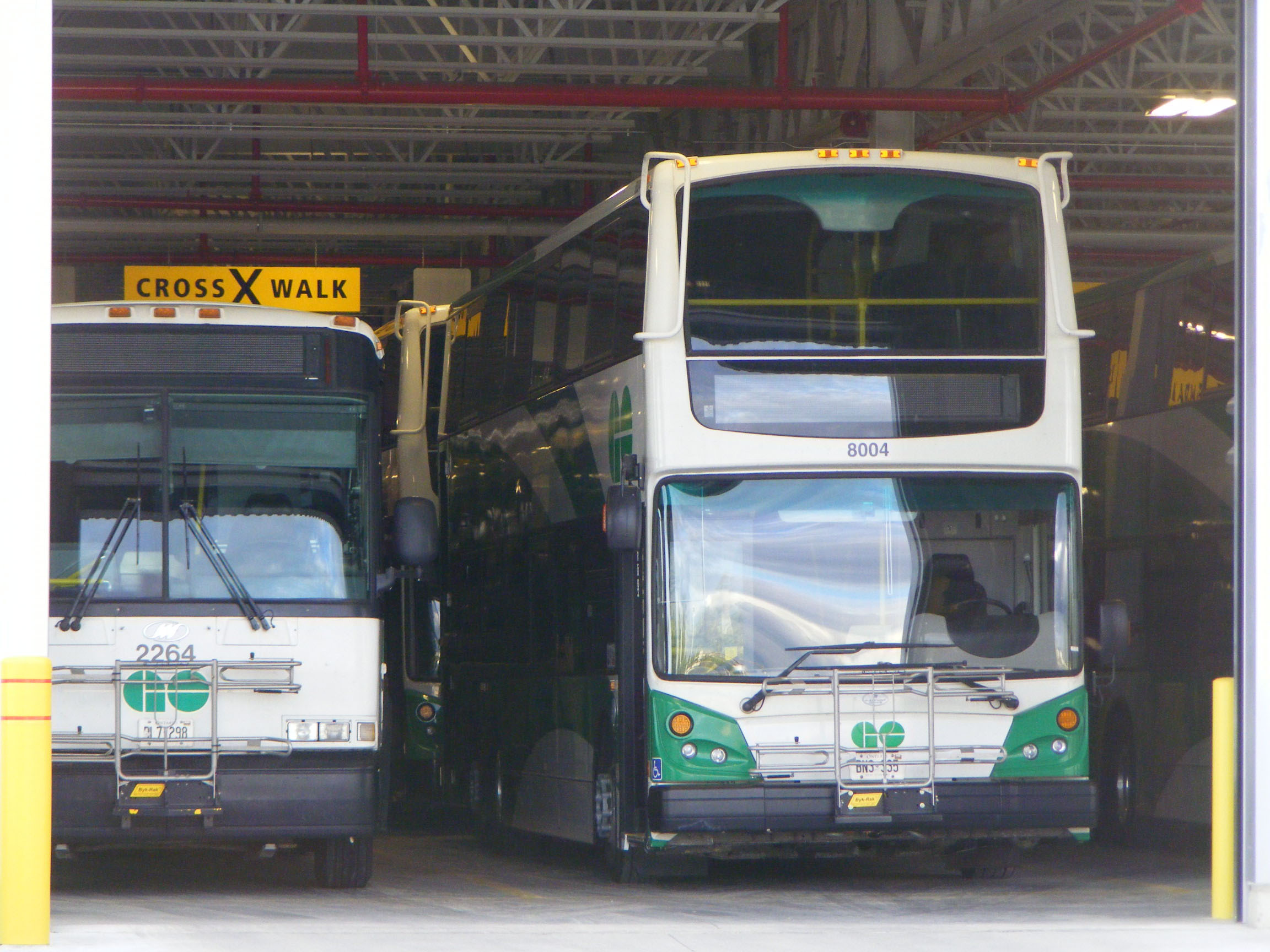 Seen in July 2009, only four months after its opening is GO Transit's bus facility at Streetsville. The depot is a state of the art facility with many environmentally friendly features: a 100% highly reflective white roof that has the effect of reduced heat, as well as a reducing air conditioning loads; a low-irrigation green roof over the administration areas; subsequently filtered rainwater can be used for irrigation of exterior landscaping; finishes with reduced levels of volatile organic compounds and an on-site co-generation facility to produce electricity and use waste energy to heat the place. Above all else it is designed so that the fleet of Alexander Dennis Enviro500 doubledeckers have no problem entering the building or being raised on lifts inside.