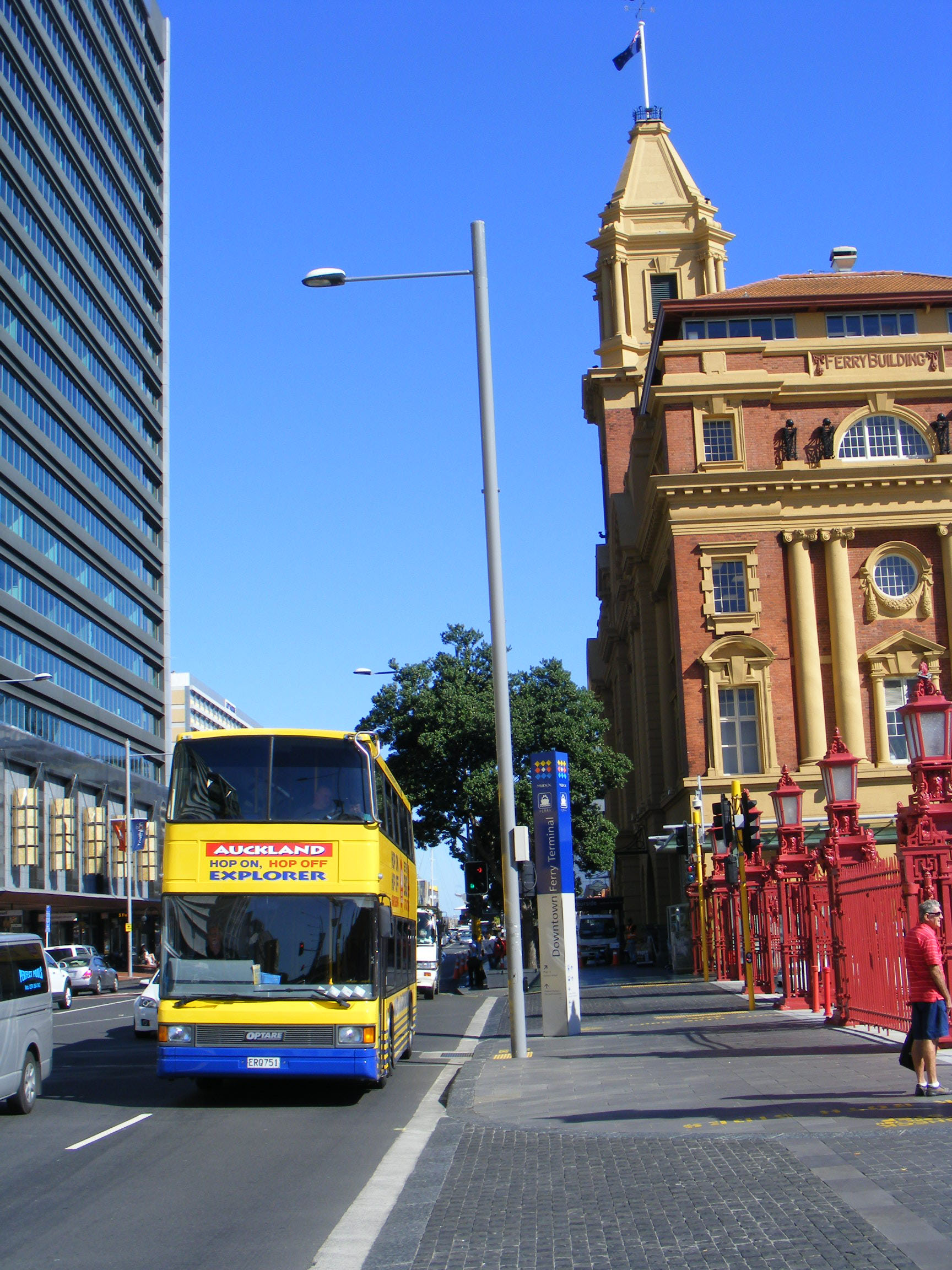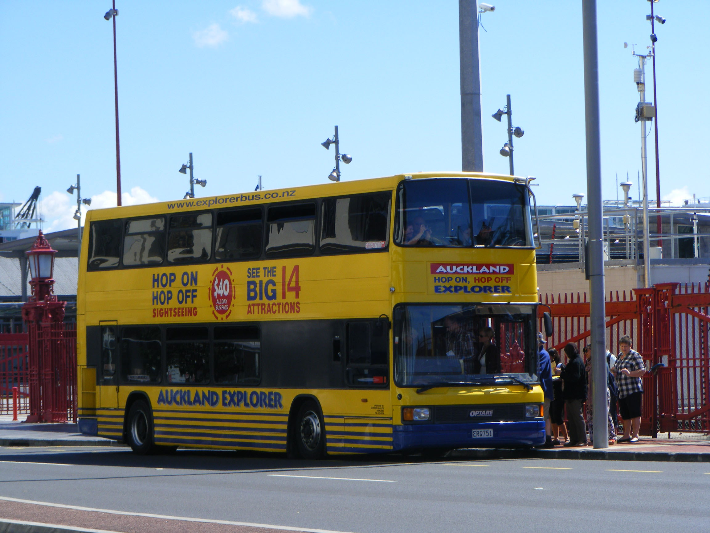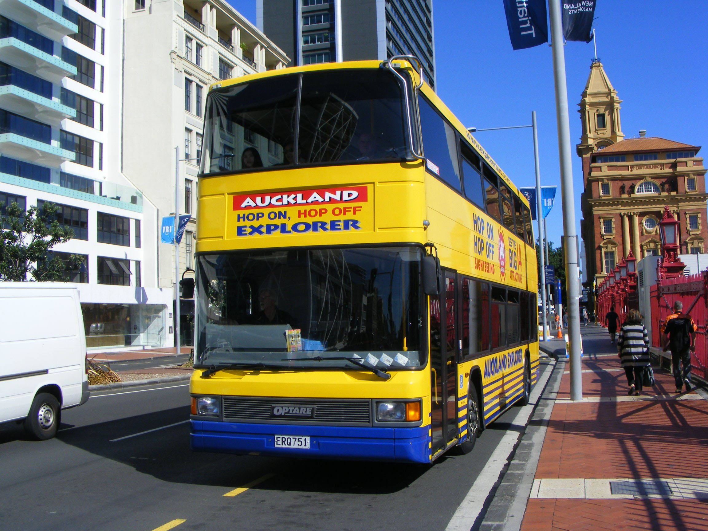 An earlier Anglian livery lived on in New Zealand. Seen in March 2013 the Auckland Explorer was in the hands of nationwide operator Ritchies and an Optare Spectra doubledecker had been acquired to operate on the service. The bus was formerly 501 (YJ56ASZ) new in 2006. The UK livery conveniently needed no modification for use on the tour. The bus is seen departing the Ferry Terminal. |