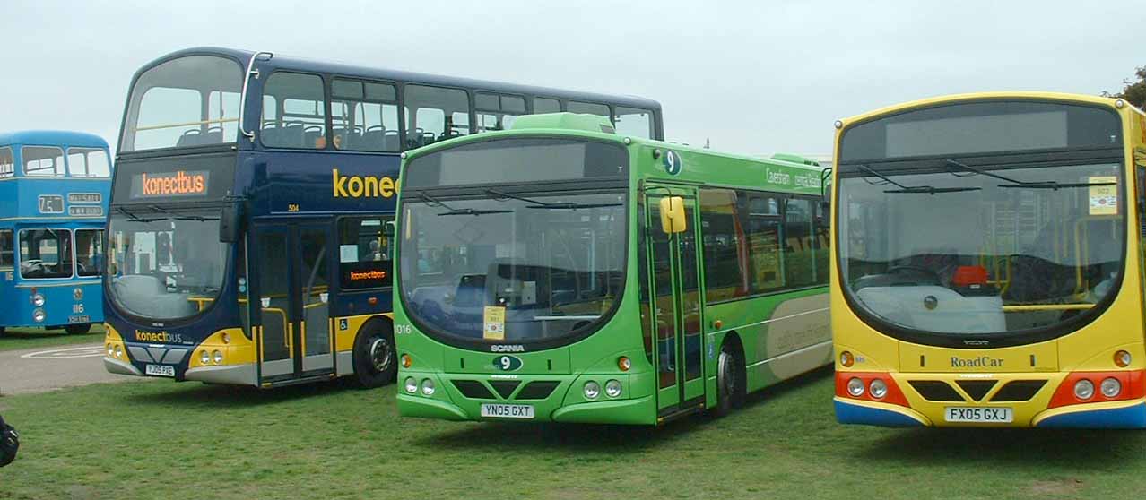 The Optare Delta is based on DAF's SB220 chassis and Konect's first deckers were these Wright Pulsar Gemini DAF DB250LF buses. They were the first DAF/Wright deckers outside London. A batch was purchased in dedicated livery for Norwich Park & Ride, but just one spare bus was ordered in fleet livery, 504 (YJ05PXE). It is seen at SHOWBUS 2005 in the company of two other Wright singldeckers, one each for Reading Scania L94UB 1016 (YN05GXT) and Lincolnshire Road Car Volvo B7RLE 831 (FX05GXJ).