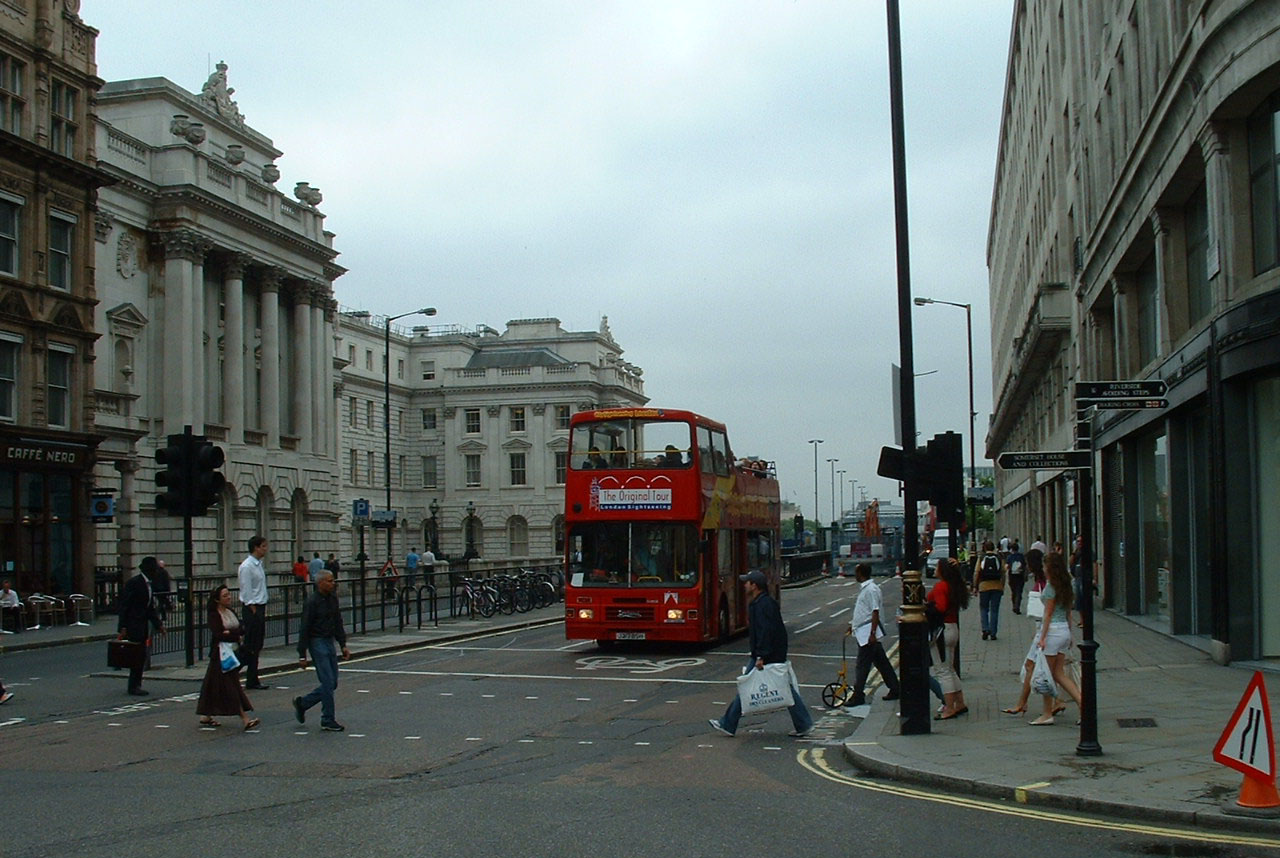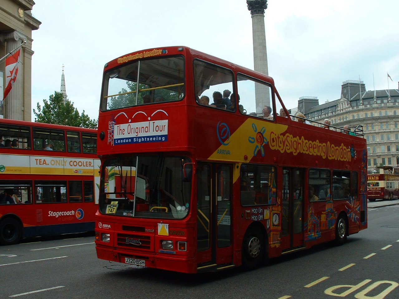 On the same day in August 2006, Original London Sightseeing Tour OA320 (J320BSH) leaves Trafalgar Square via The Mall: Nelson's Column is behind. |