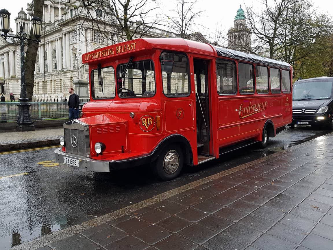 Another small City Sightseeing bus was this former Ulsterbus Wrights bodied Mercedes 709D, 840 (NXI6840). Clearly the bus has been heavily modified following an arson attack, re-emerging complete with a foldable canvas roof. It was christened "Endeavour", renumbered 5 (CZ1988) and transferred to the associated Flexibus fleet and used on a variety of tourist services from Coleraine and Larne before being sold for use as a feeder bus to the Belfast City Sightseeing service as seen in the city in November 2018. The new owners, Belfast City Sightseeing, have numbered it 7. Besides the obvious open top doubledeckers, they have an opentop ex JMT Leyland Tiger PS1.