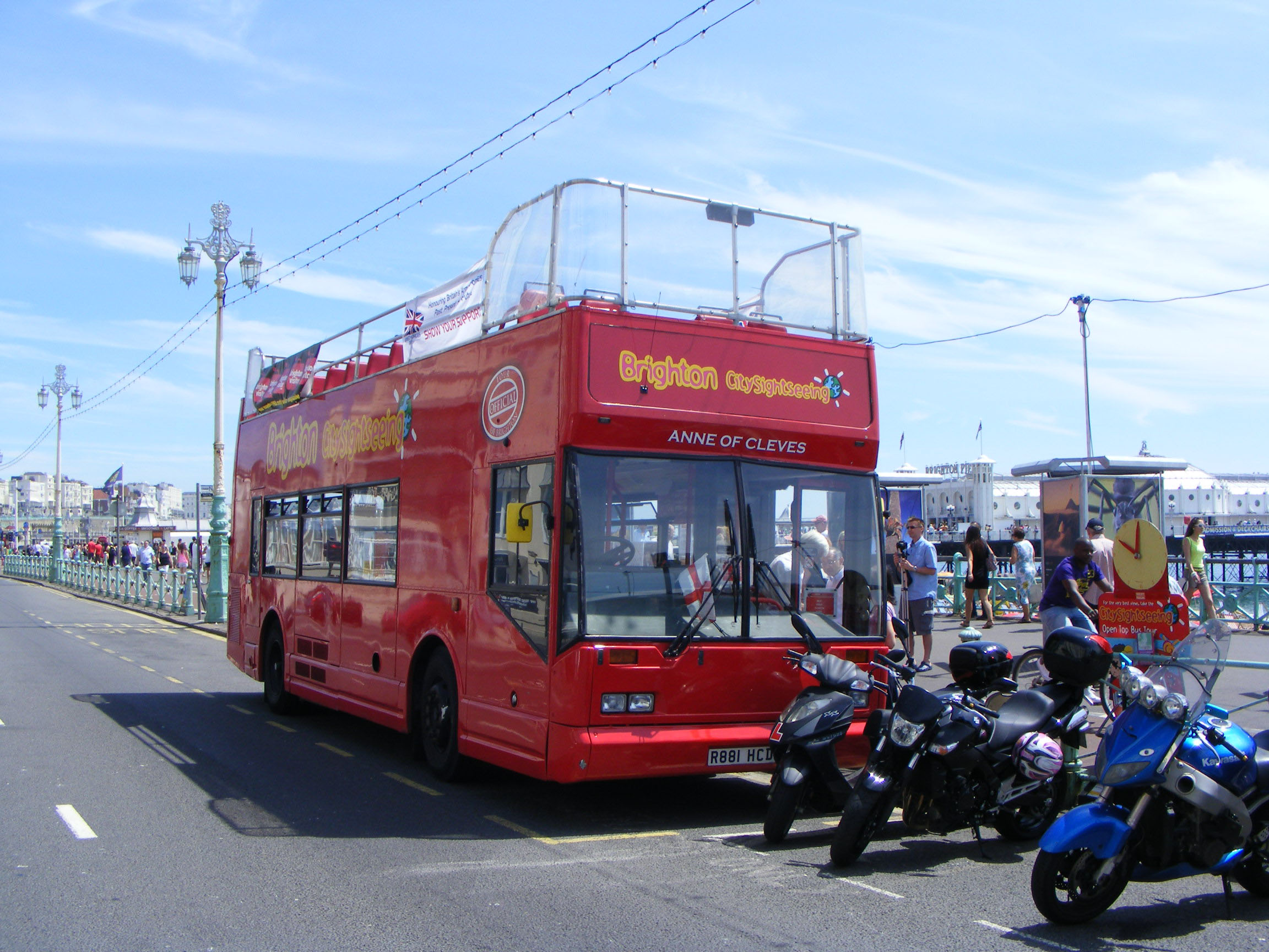 To secure trade Brighton usually has a bus permanently on station by the Pier. Back in July 2010 this honour befell Scania N113DRB 781 (R881HCD). The vehicle was new in 1998 with coach seats, but has since had more waterproof seating fitted after loosing its roof!