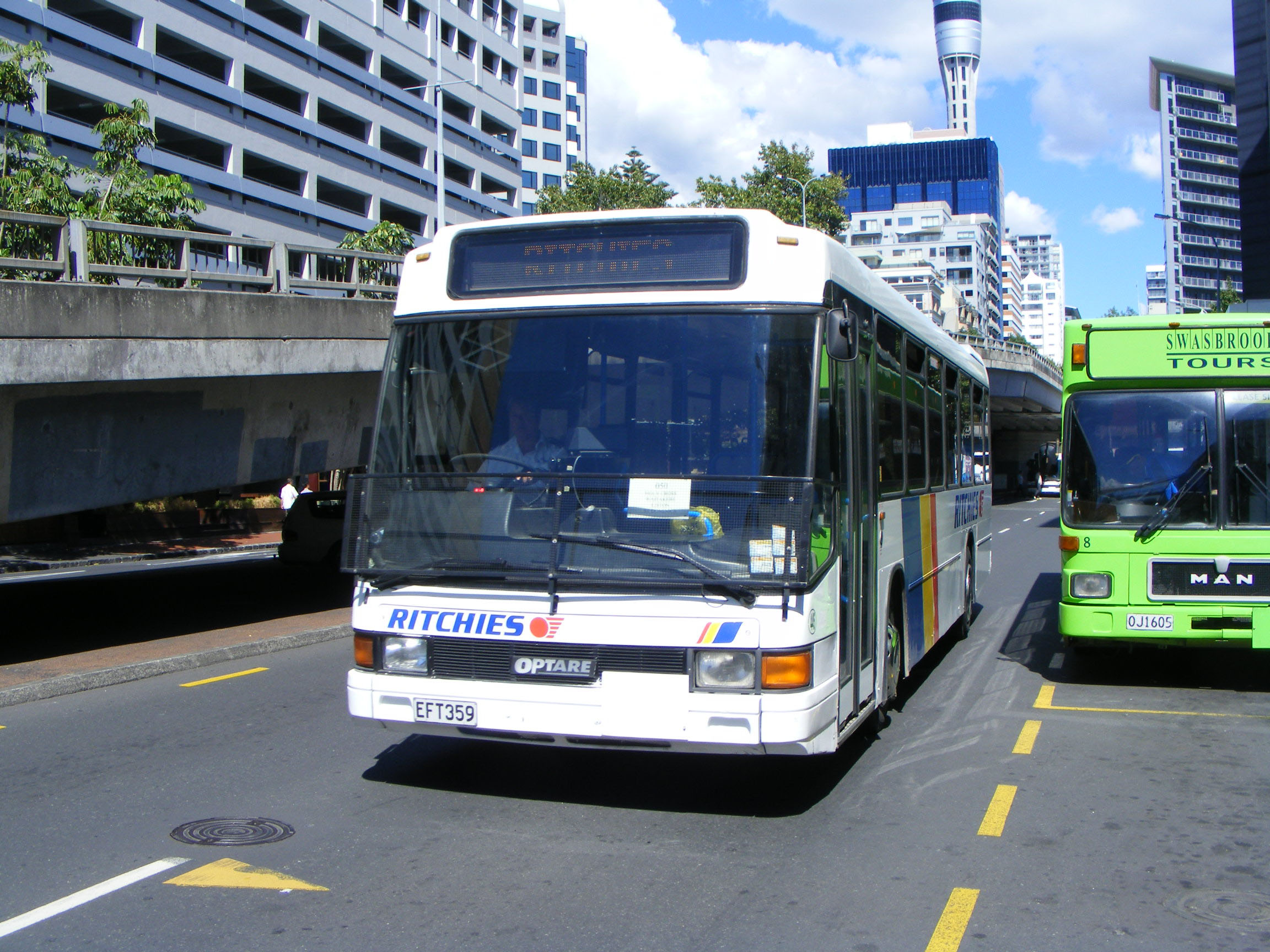 Ritchies had five Deltas from Reading Buses, PBC Party Bus taking a further five. Seen in the city is 443 (EFT350) alongside Swasbrook Tours MAN SL202 8 (OJ1605) new to RedBus as 658 in 1989. Strange to think that the bus delivered to Reading Buses in 1996 as 518 (N518YTF) would end up in sight of the Auckland Sky Tower seventeen years later.