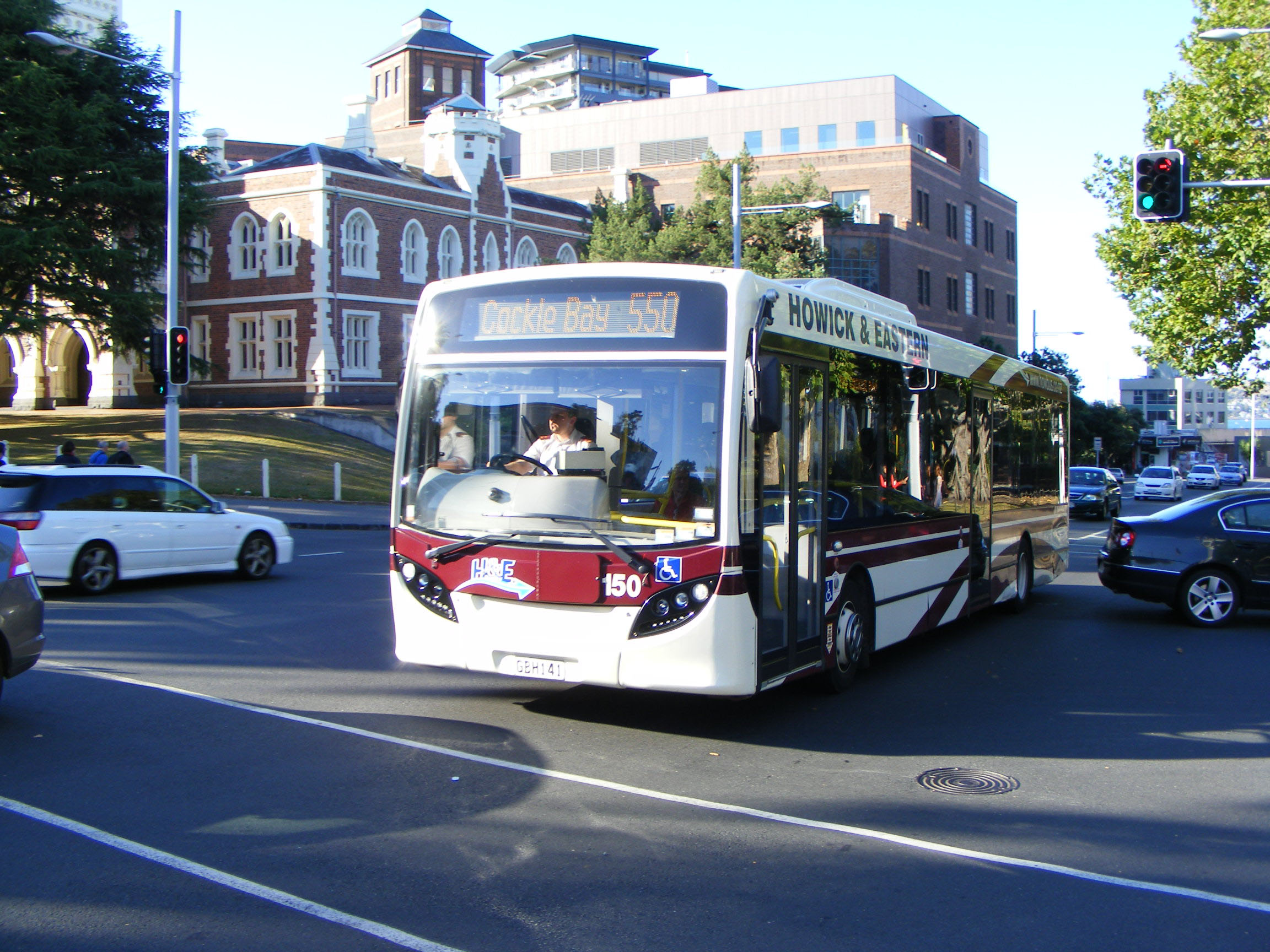 The blind changes and it can be seen that the 550 also serves Cockle Bay. The Howick & Eastern colours are no longer seen on Enviro200 buses in Auckland. Enviros 150-152 were given turquoise livery and despatched to Waiheke and those remaining from the initial deliveries have been given AT Metro livery. |