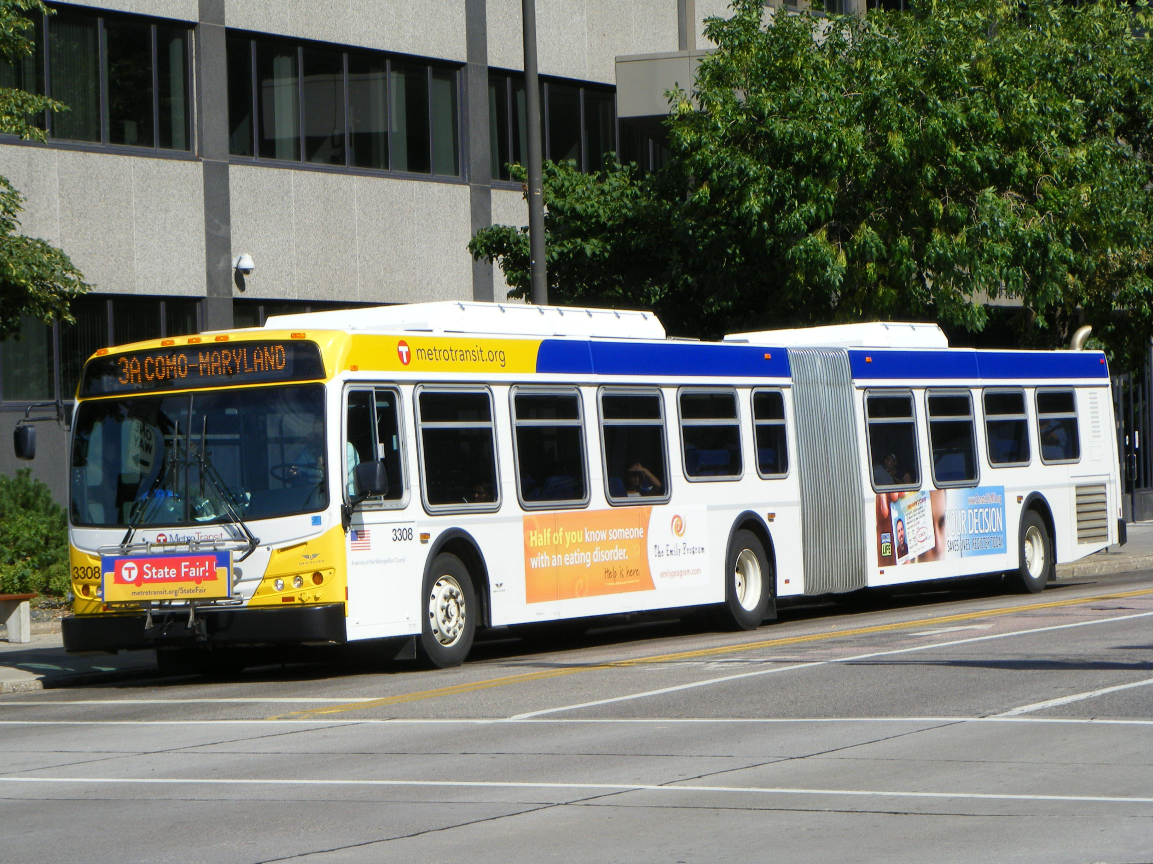 New New Flyer D60LFR 3308 displays a special running board on the front dash for the State Fair.