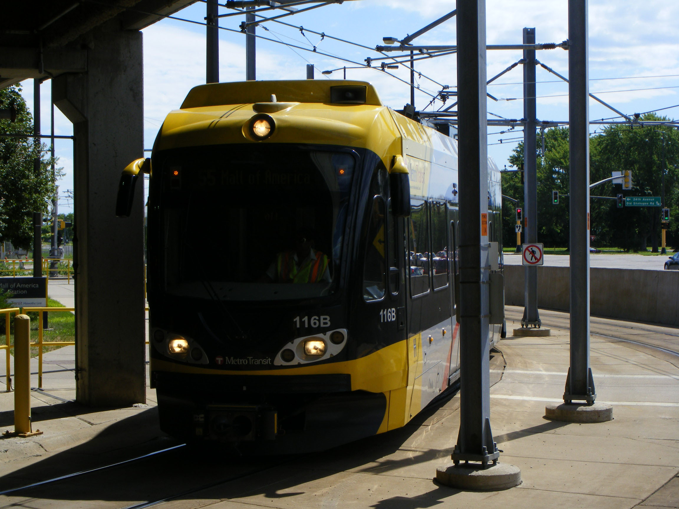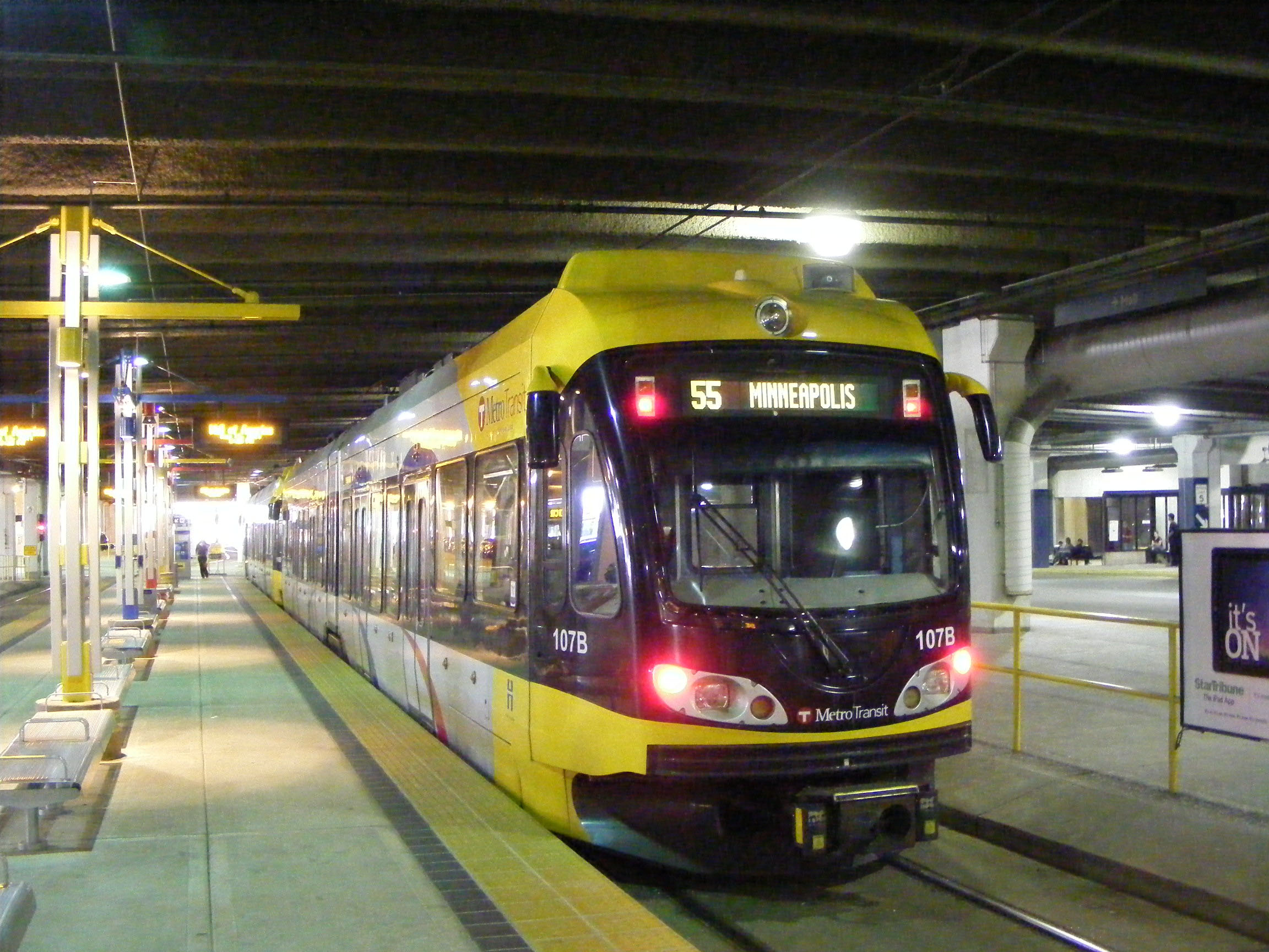 The Bombardiers on this page appear to be ad free, thus displaying fleet livery for the streetcars. This one carries fleet number 107B, suggesting the opposite end is simply 107. The units are only two cars long.