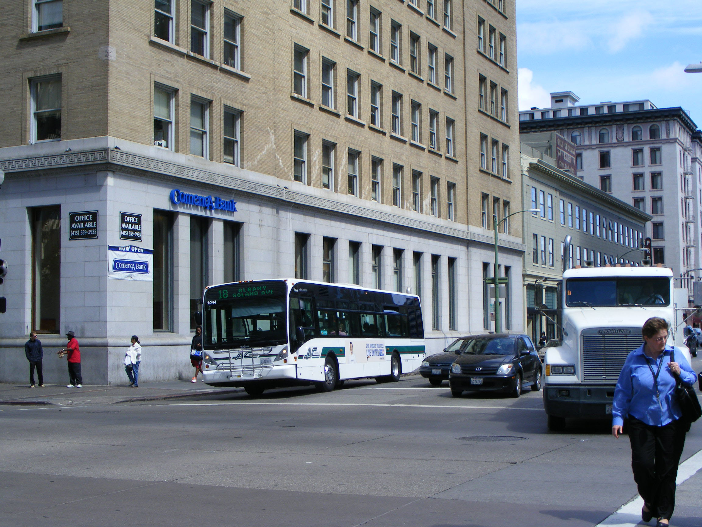 Seen in Oakland in August 2008 is Van Hool A330 1044.