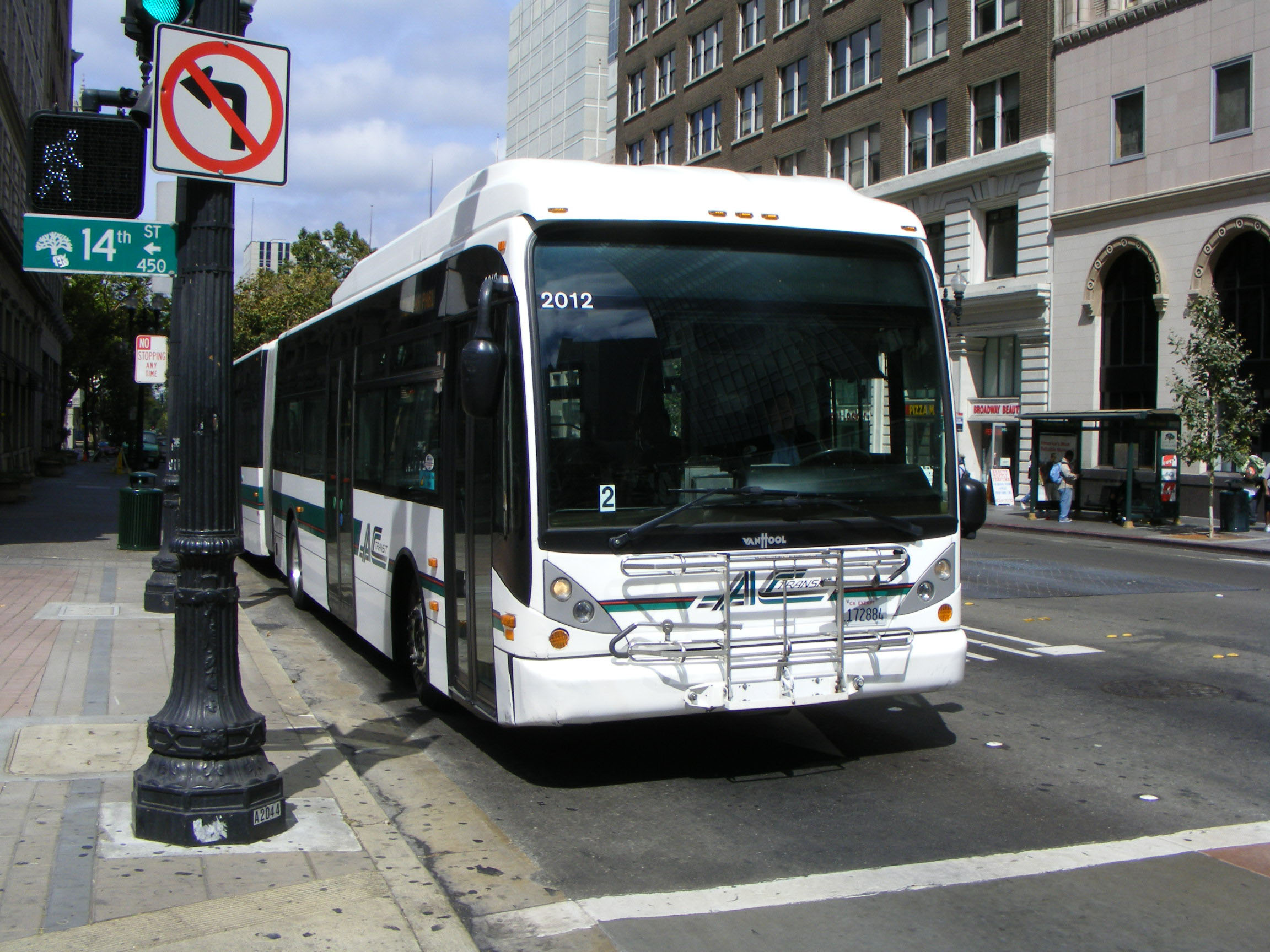 August 2008 and two Van Hool AG300 artics thread their way through traffic in downtown Oakland with blue blinded 2048 in the lead.