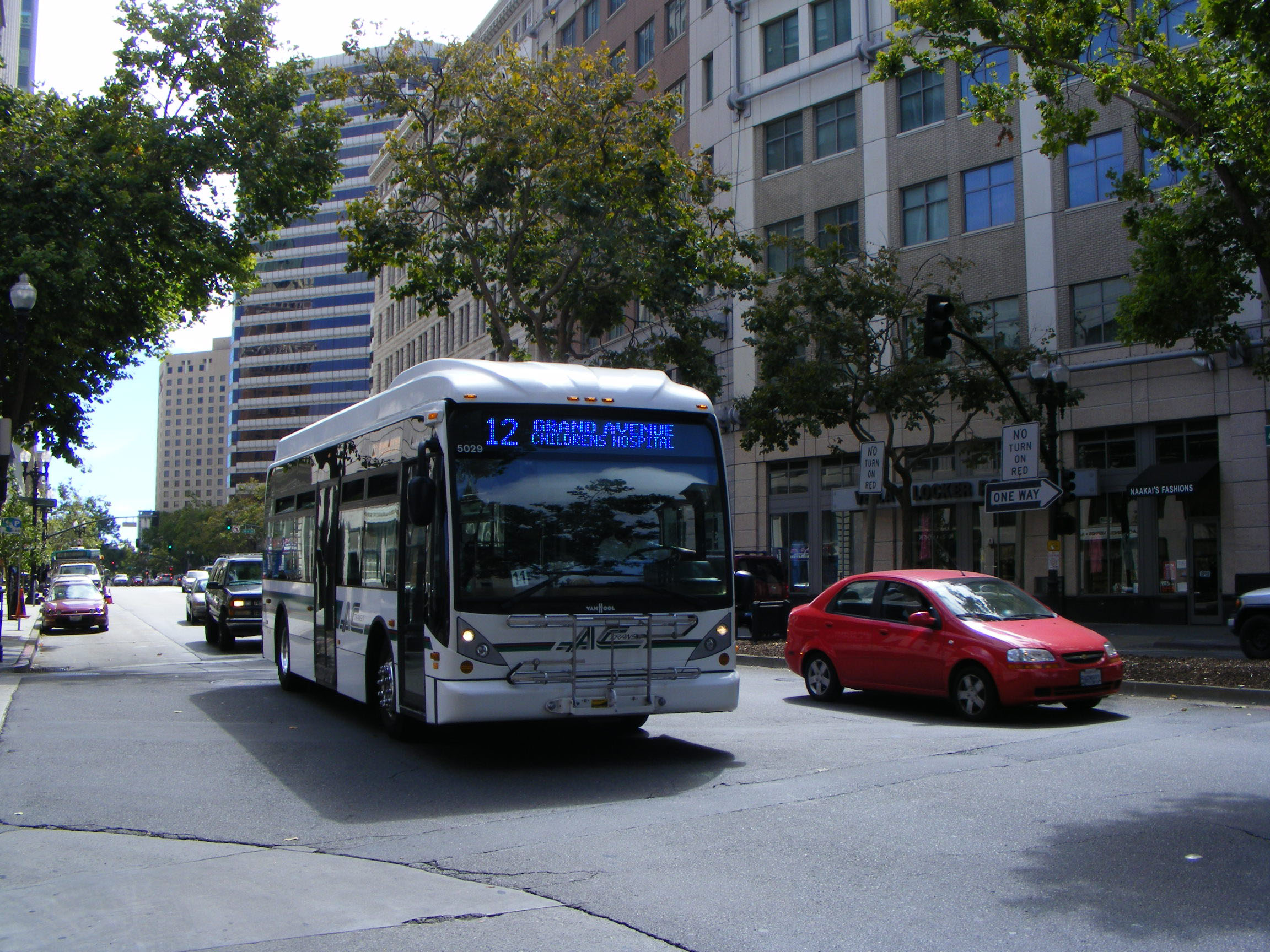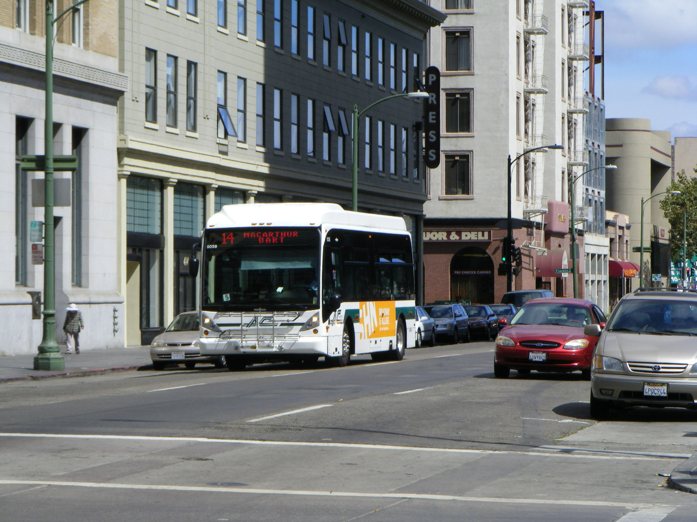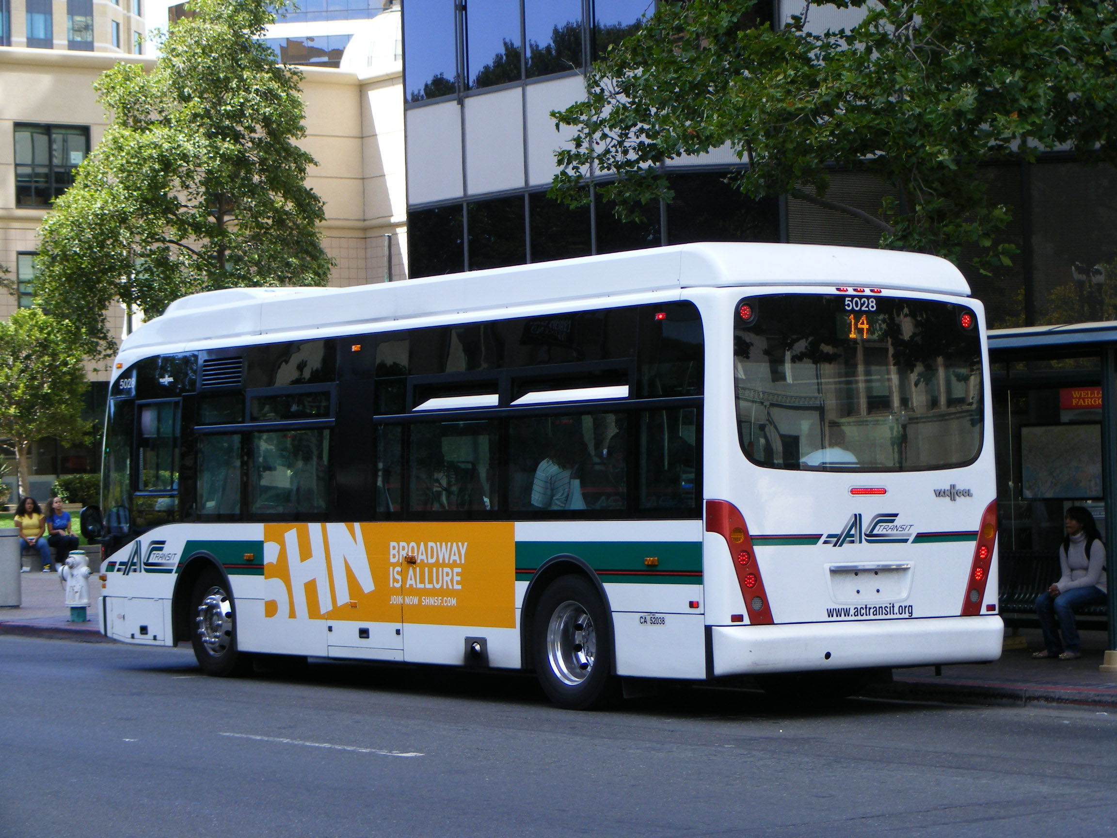 Special red blinds are seen on AC Transit Van Hool A300K 5028. These short Van Hools were bought for routes which penetrate the denser residential areas where they have a better manoeuverability than a 60 foot long artic! The Dennis Dart MPD springs to mind.