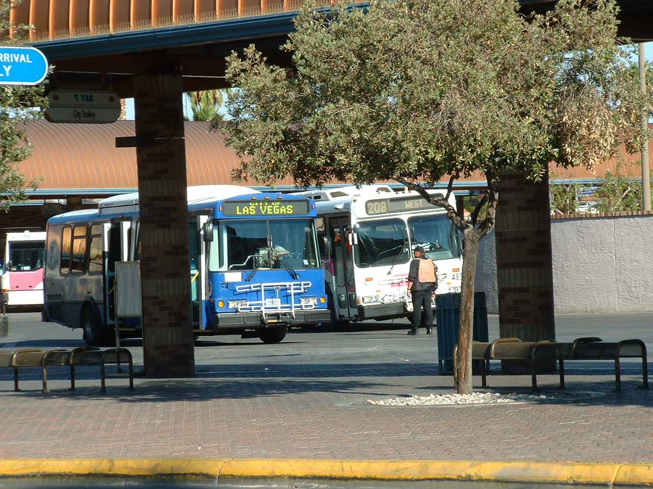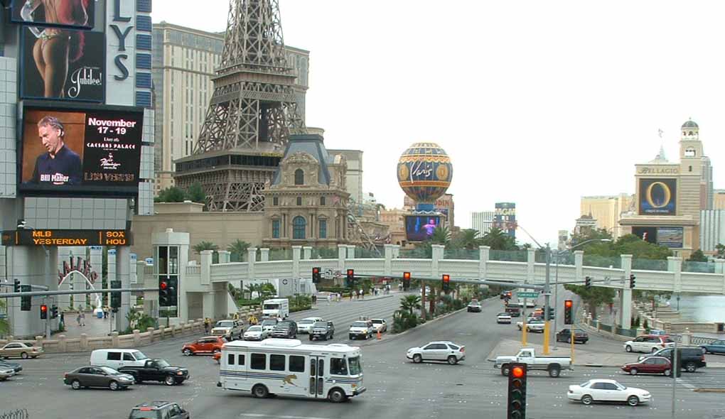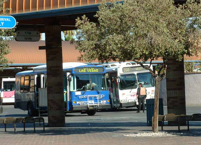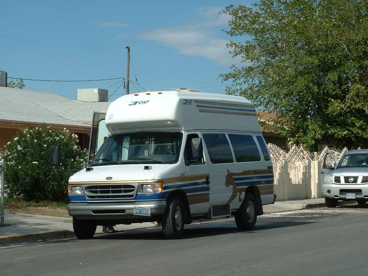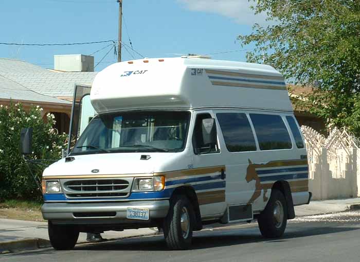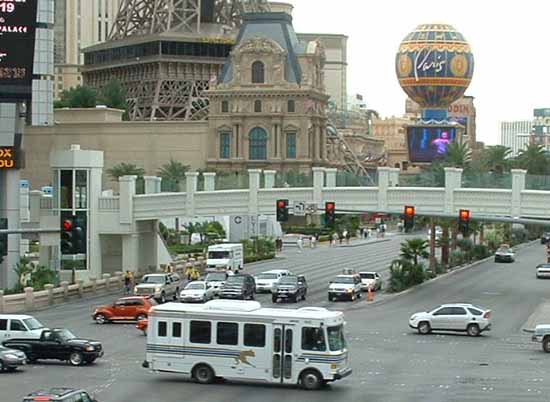One of CAT's midibuses traverses "The Strip" at the major intersection by Caesar's Palace, though it is Paris which dominates the background, which is opposite the Palace. The vehicle is often used as the basis of a midi size mobile home. It is in the new blue and gold relief colours.