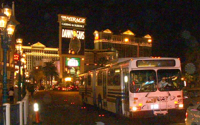 These older high floor New Flyer CATs were allowed out on the Strip service, 301 was seen in 2005. Here 517 is seen at night with, as always, a good load, with Caesar's Palace towering behind.