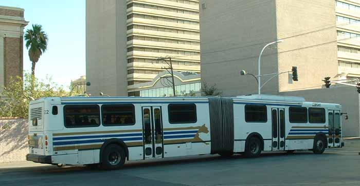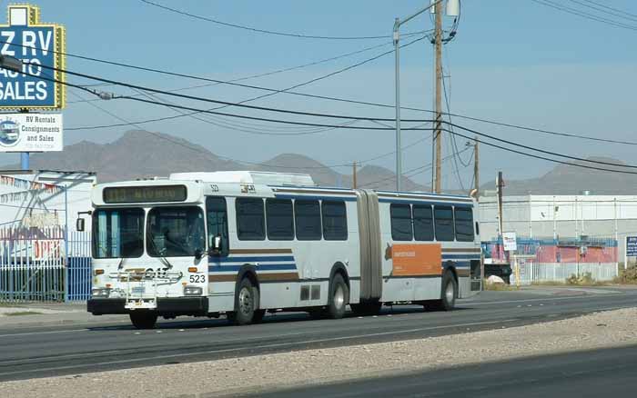 New Flyer artic 523 is seen on Las Vegas Boulevard North, heading south for the DTC. It is in the new blue and gold relief livery, which is slowly replacing the magenta and jade colours. The gold cat effect on the rear saloon has been lost under an advert.