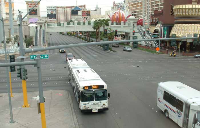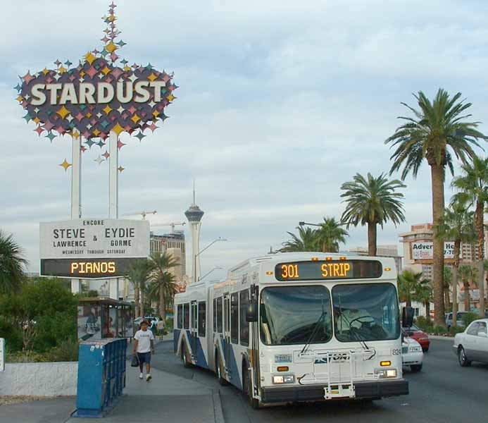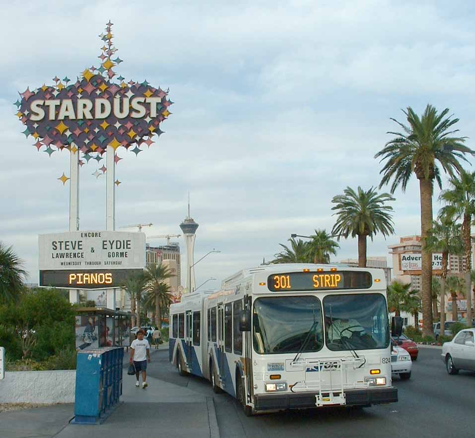 CAT 824 is one of the low floor fleet of New Flyer D60LF artics in use on "The Strip" until the end of October 2005 when The Deuce took over. The original magenta and jade livery layout had been retained, but uses the new blue and gold colours. The bus is seen outside "Stardust" the day before New Flyer operation ceased. |