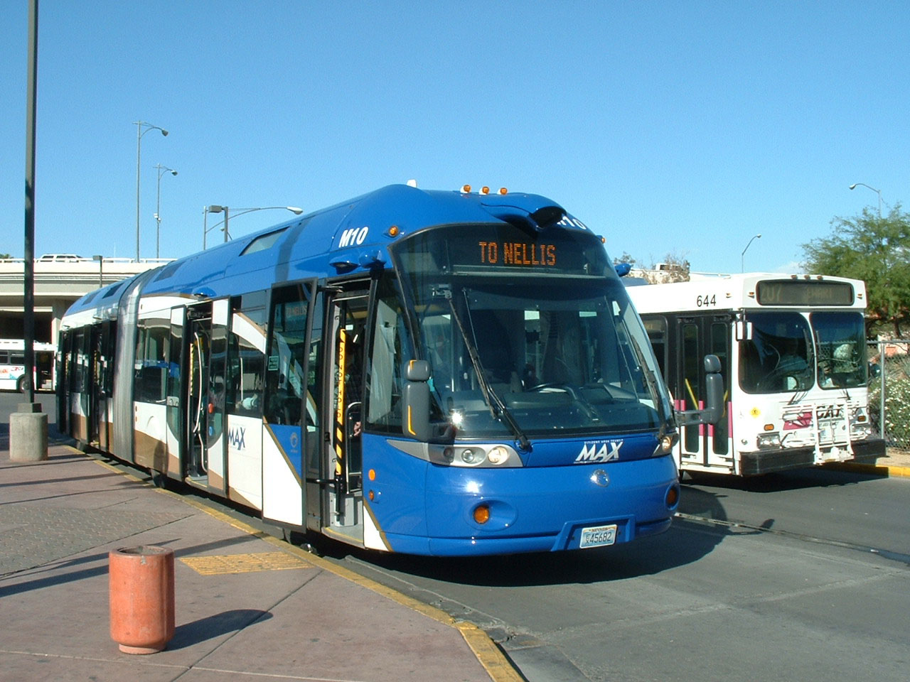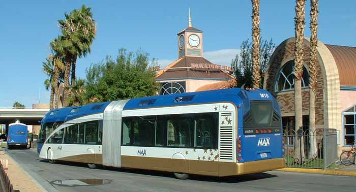 There could not be a greater contrast in styles between the old and the new. A high floor New Flyer, 644, plods by M10 in the fleet of RTC's CAT. M10 is an optically guided Irisbus Civi. The optical guidance takes over on the approach to bus stops to bring the bus just the right distance from the kerb for boarding and alighting. M10 and 644 are seen at the Downtown Transit Center.