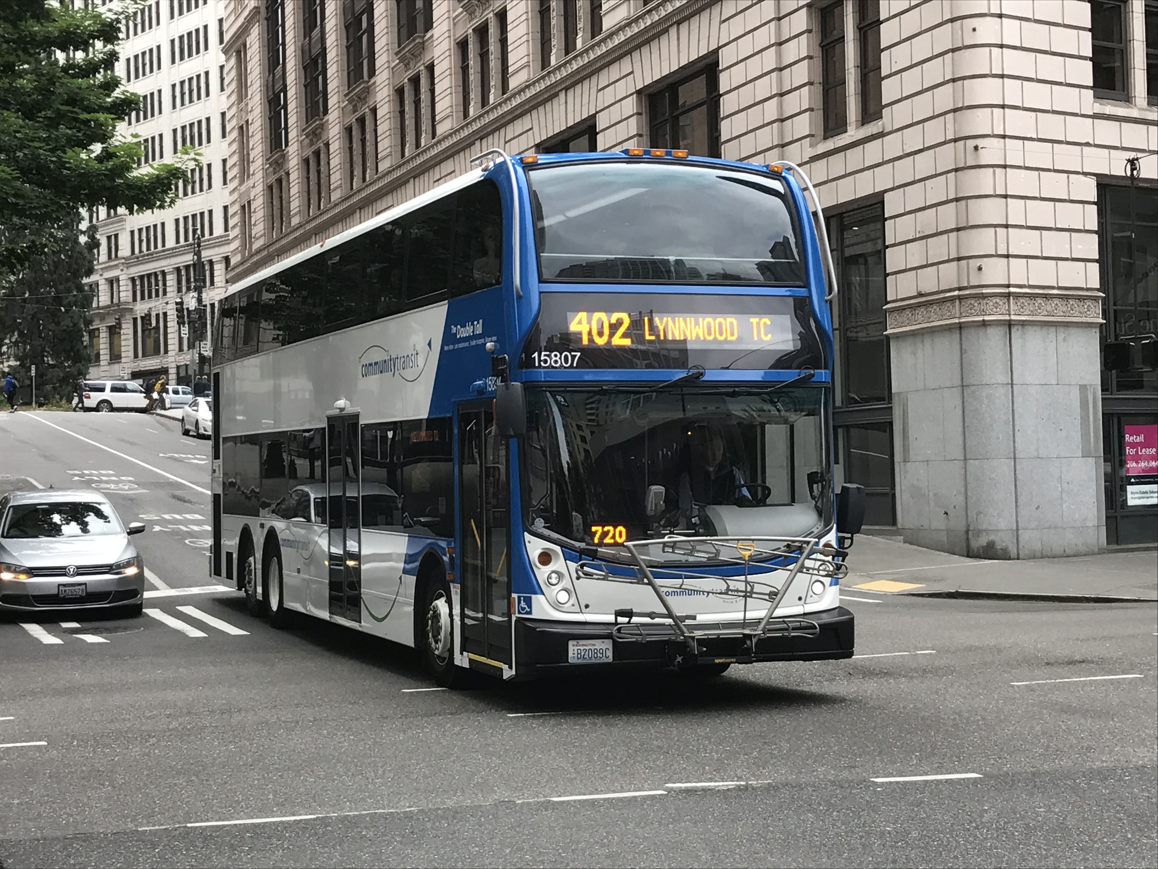 The tight turn into descending Olive Way, after a long straight run through downtown, gives great poses by Enviros like 15807 as they contemplate the downhill run.