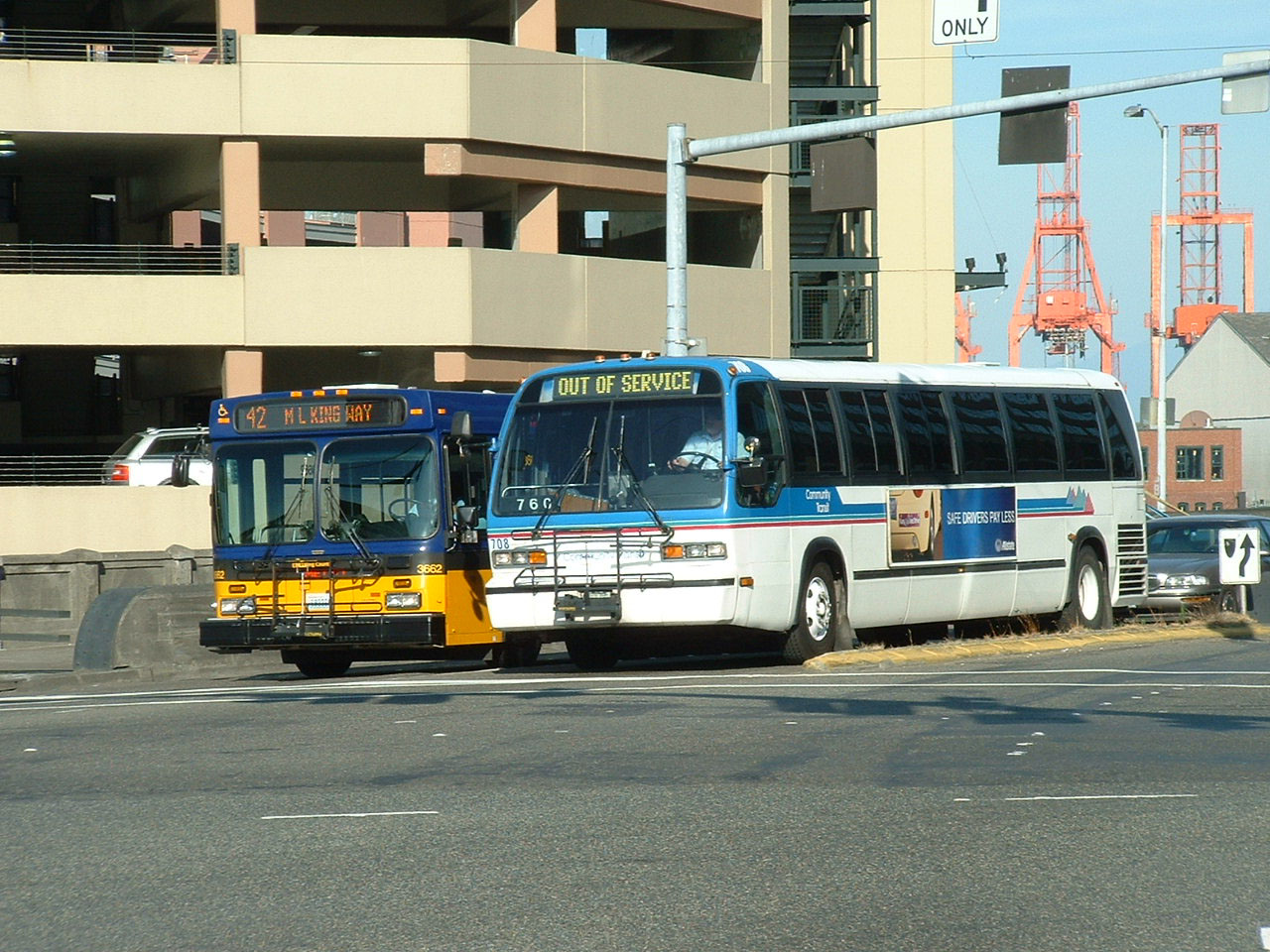 Community Transit operate commuter services from north of Seattle to the city and locally routes in Everett. Back in August 2004 when this picture was taken the fleet appearing in downtown were a mixture of RTS buses, like GMC 708 above, and New Flyer bendis. Alongside 708 is a King County Metro Flyer, 3662.