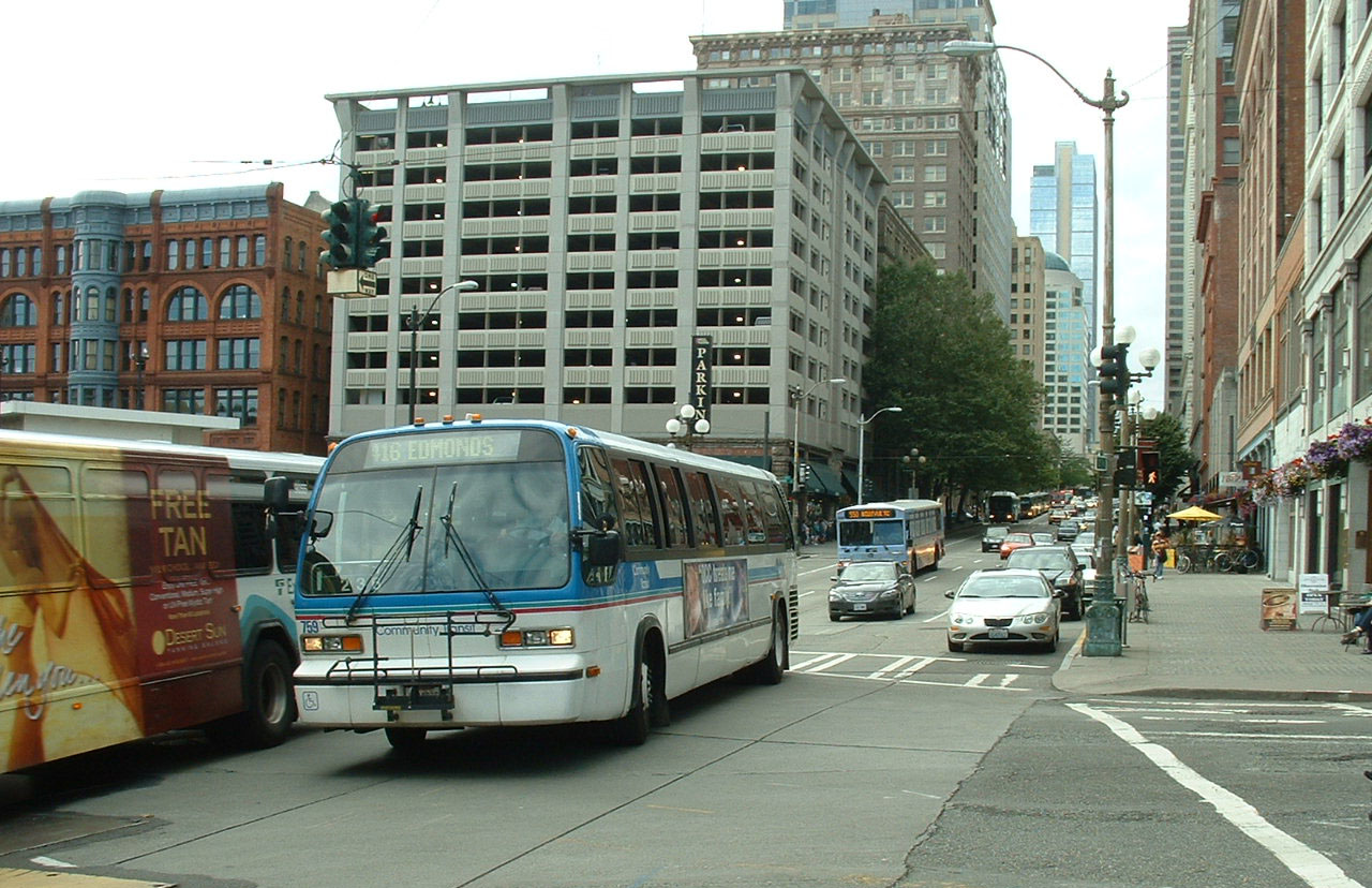 The RTS buses were still going strong three years later in August 2007. Community Transit's first TMC built RTS 759 is seen in downtown Seattle.