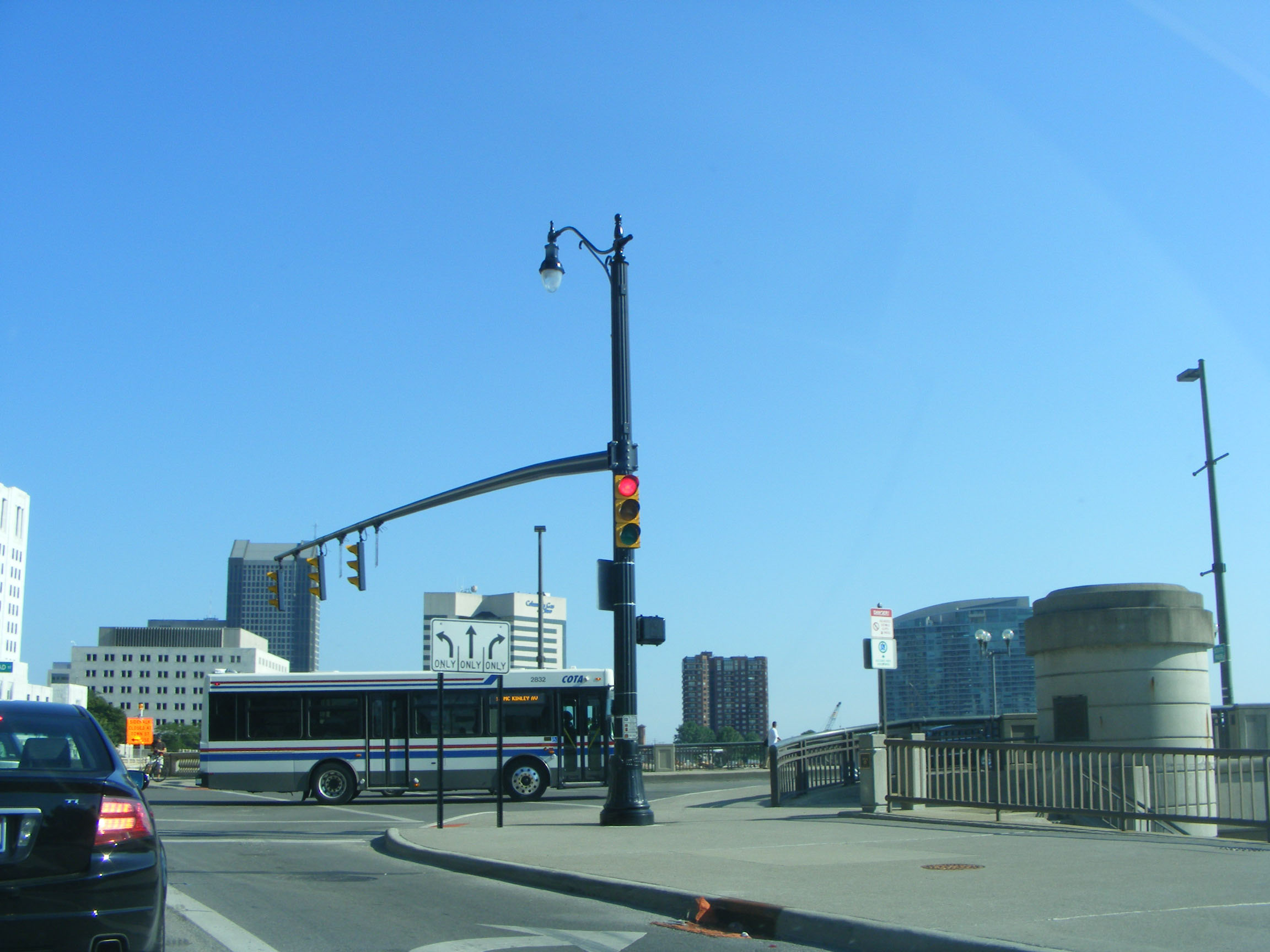 The Central Ohio Transit Authority is the main operator in the state's capital city, Ohio. The fleet is dominated by Gillig Advantage models including this mid sized example, 2940, seen in the city centre in late July 2010.