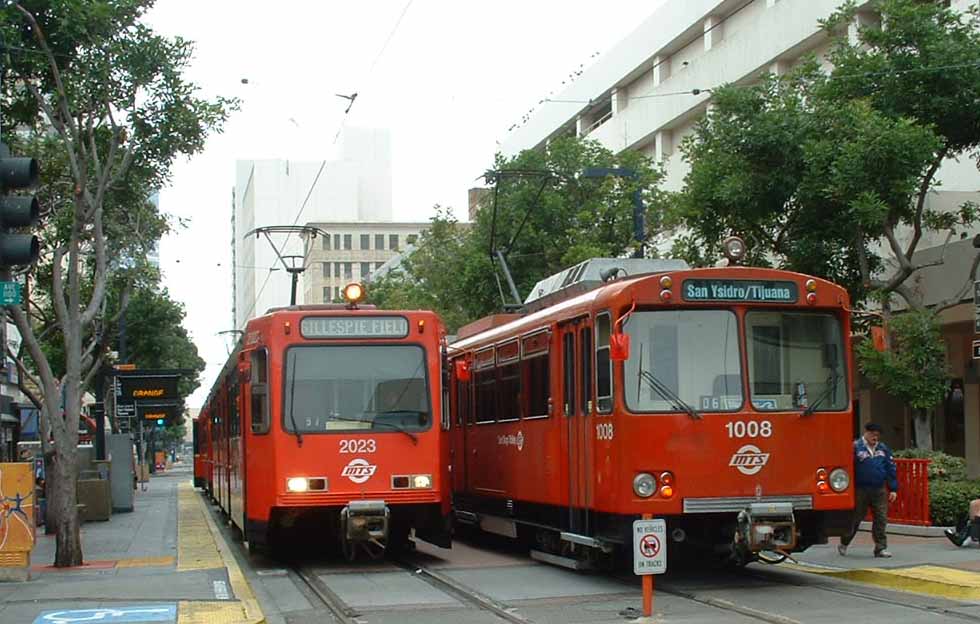 On the main east track through downtown San Diego two generations of Siemens trams meet: 2023 of 1995 and original 1008.
