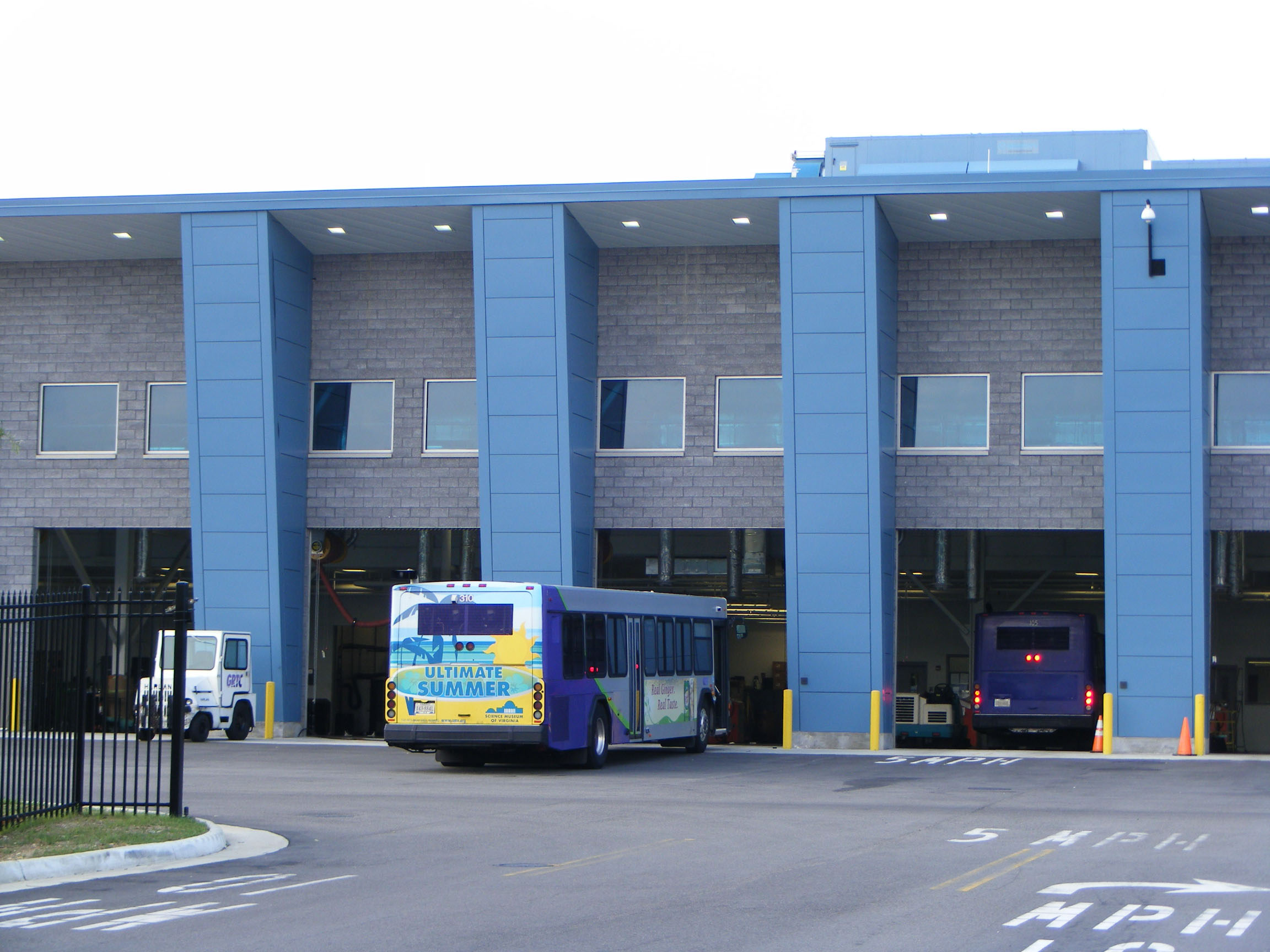 Gillig 310 and another Advantage, 105, are seen receiving attention in the brand new depot, which had only opened the year these images were taken, in 2010.