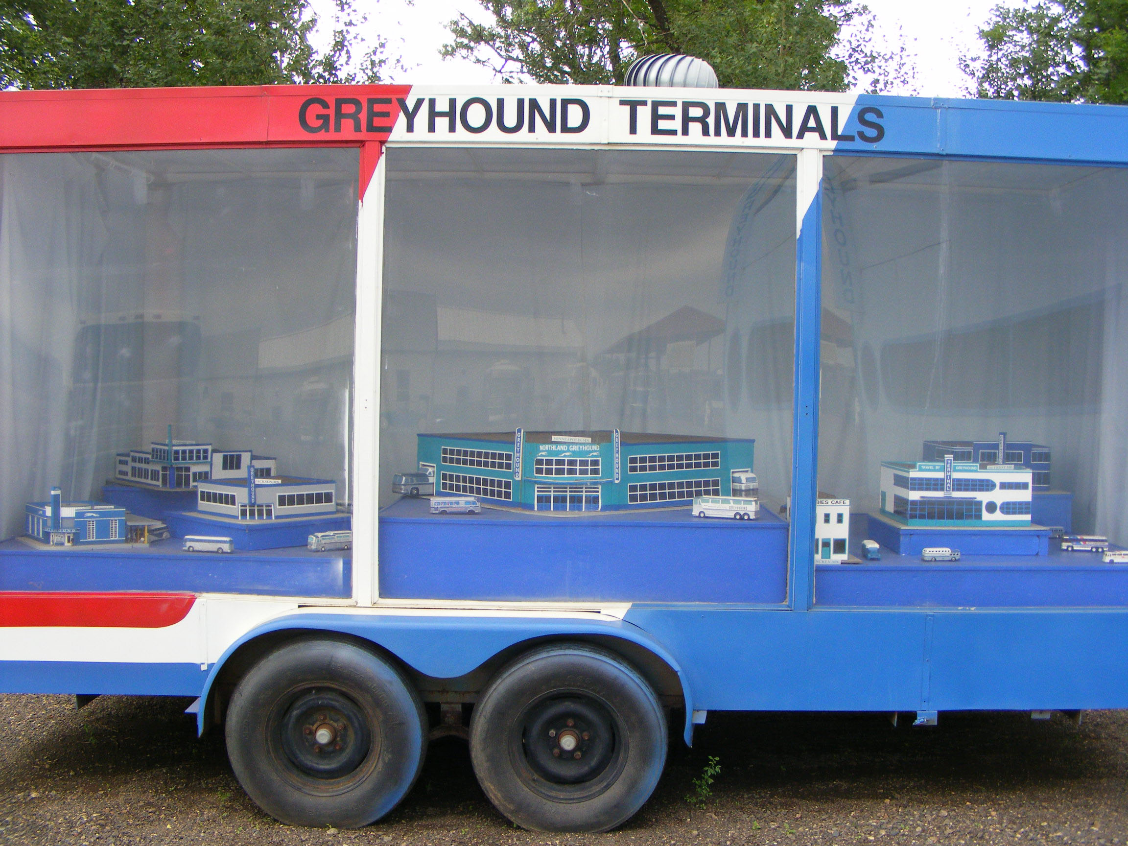 This display in a trailer shows some of Greyhound's iconic art deco designed terminals.