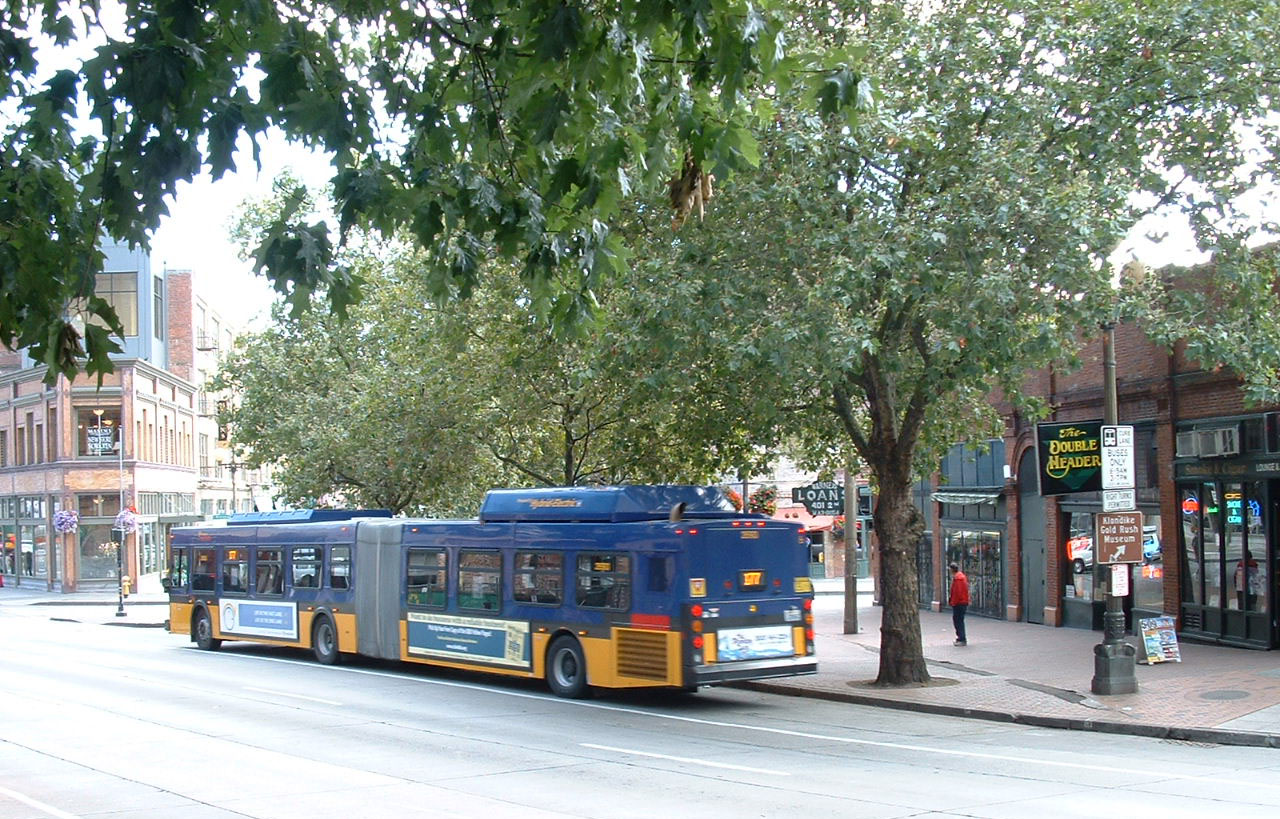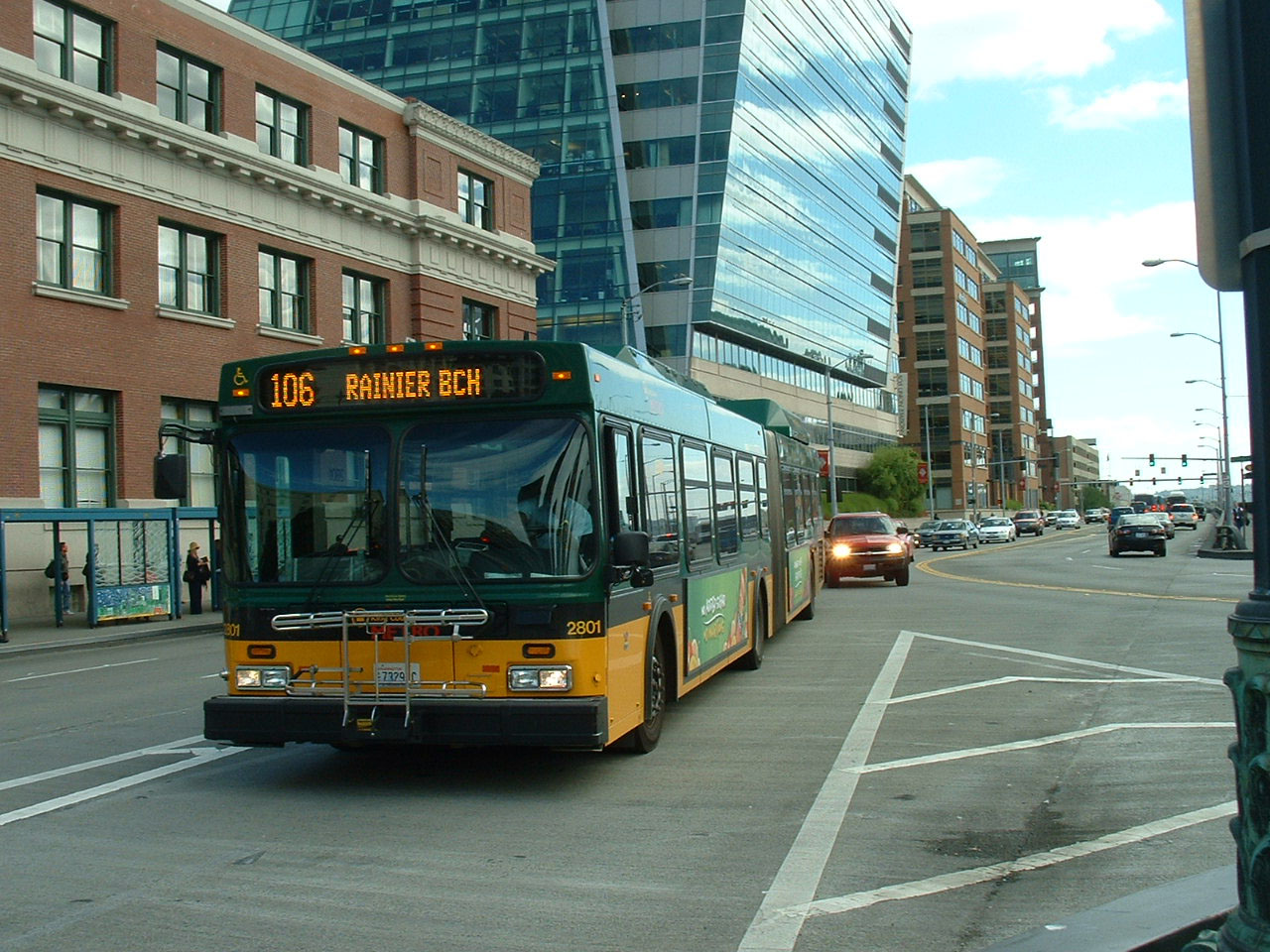 An October 2014 view in classic Seattle weather! The high and low versions of the diesel New Flyer D60 are seen side by side, D60HF 2308 nearer the camera with D60LF 2886. Both diesel variants have been withdrawn.