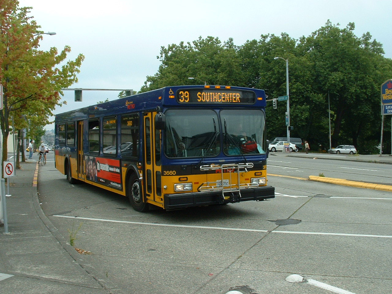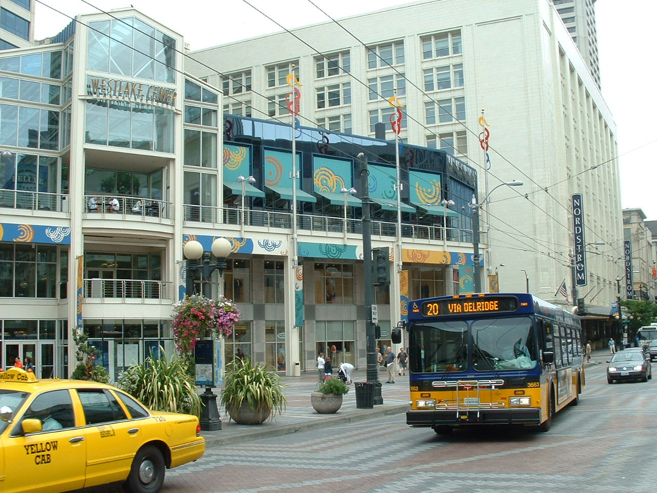 Approaching the boutique Westlake Park in the city center is New Flyer D40LF 3663 in August 2004.